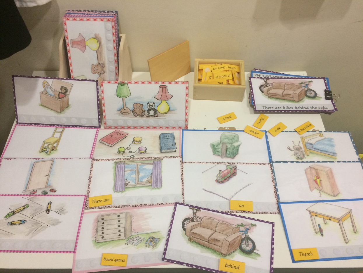 Zestaw ręczne rysowanych kart do ćwiczenia konstrukcji 'there is/are' dla dzieci. Zadanie polega na ułożeniu poprawnego zdania pod każdym obrazkiem używając małych kart ze słowami. Poza ćwiczeniem konstrukcji "there is/are" karty pozwalają również ćwiczyć: