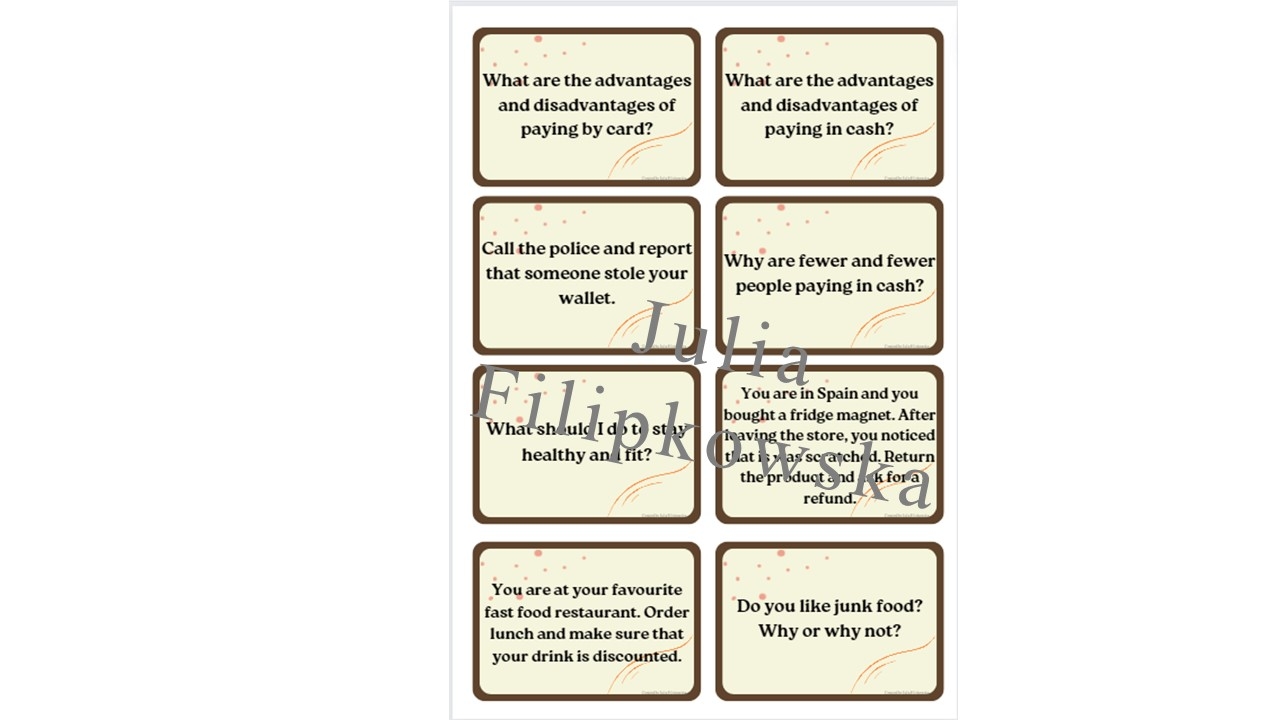 Zapraszam do zakupu materiału w języku angielskim: aż 72 pytania do speaking’u (9 stron A4). Treść jest bardzo różna, znajdują się tam między innymi zagadnienia dotyczące: składania zamówienia w restauracji, dialog w aptece, na ulicy, w sklepie z pamiątkami. Są również pytania dotyczące zdrowego żywienia, Internetu, rozrywki, transportu, choroby i wiele, wiele innych... Pytania są przeznaczone dla każdego ucznia. Dzięki tej różnorodności można wykorzystać je od 4. klasy aż do liceum, a nawet i dla dorosłych Materiał idealny na rozgrzewkę dla uczniów na początek zajęć. Polecam karty wyciąć i zalaminować dzięki czemu wystarczą na wiele lat.