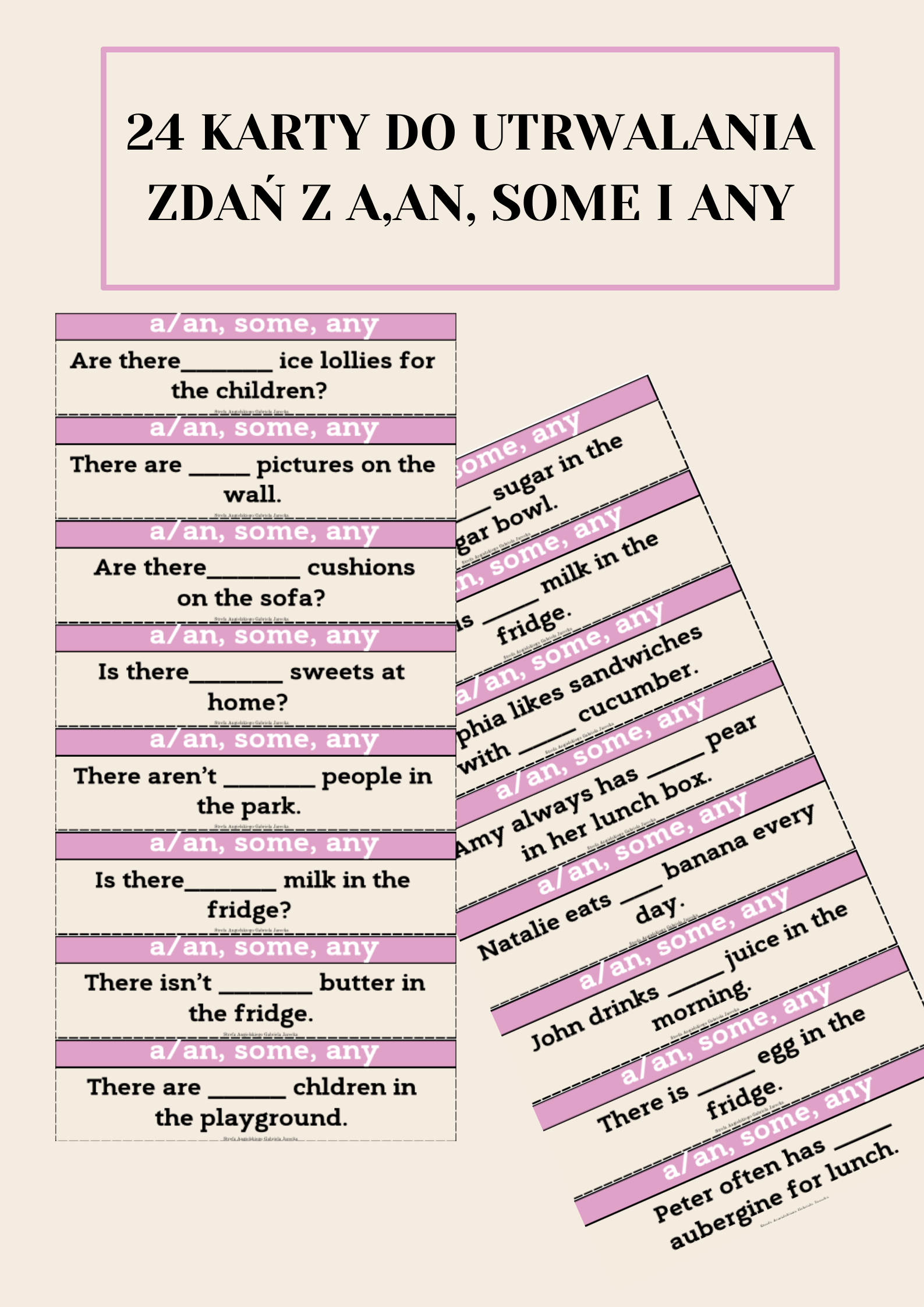 24 karty do ćwiczenia zdań z a, an, some, any. Karty można wydrukować, zalaminować i użyć wielokrotnie lub wyświetlić podczas lekcji online. Uczeń losuje kartę i uzupełnia zdanie.