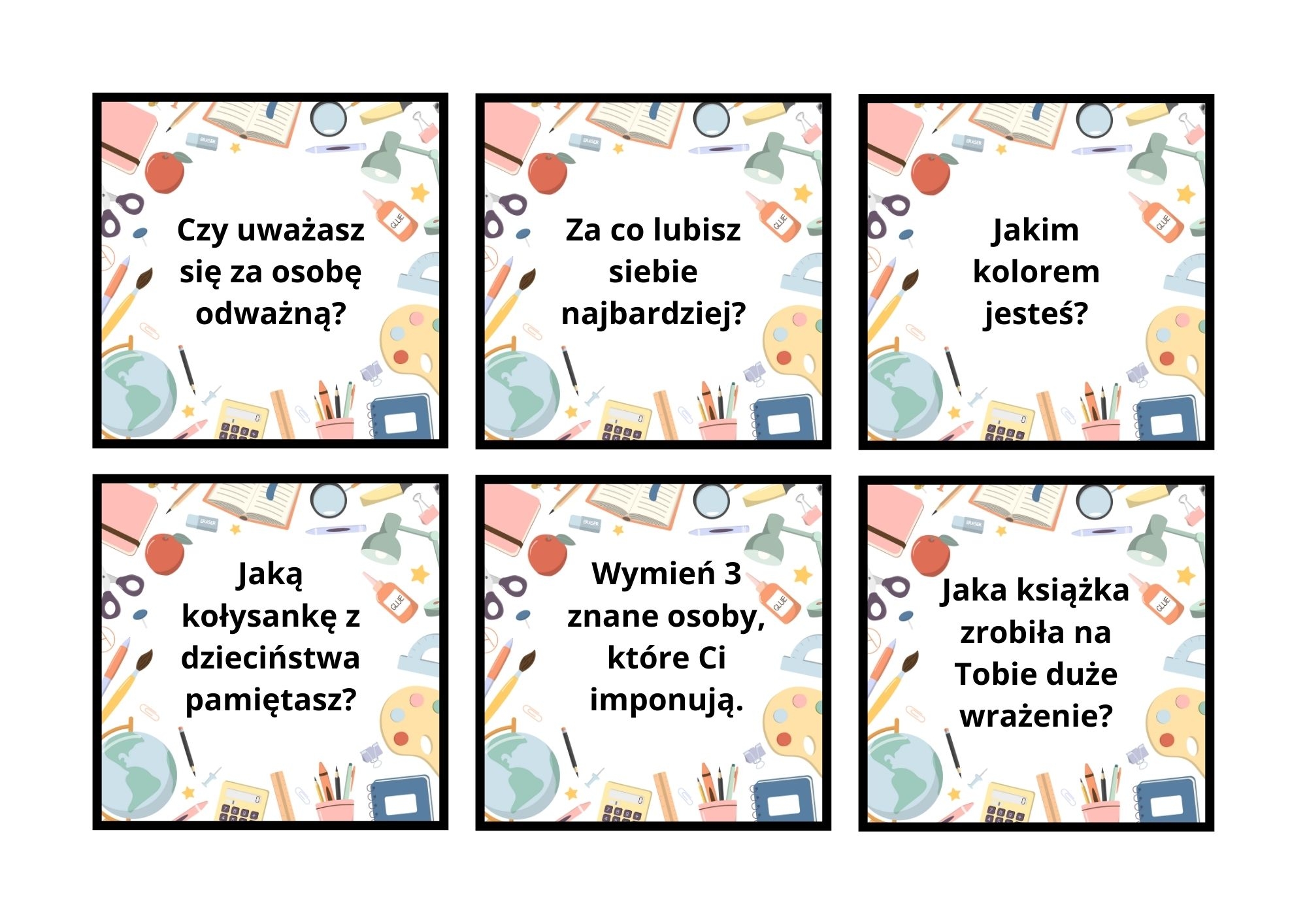 Polecam karty do zintegrowania nowej grupy, 60 kart z pytaniami, na które po kolei odpowiadają uczestnicy. Karty na 10 stronach pdf, do samodzielnego wydruku. Zacznij nowy rok szkolny radośnie i kreatywnie!
