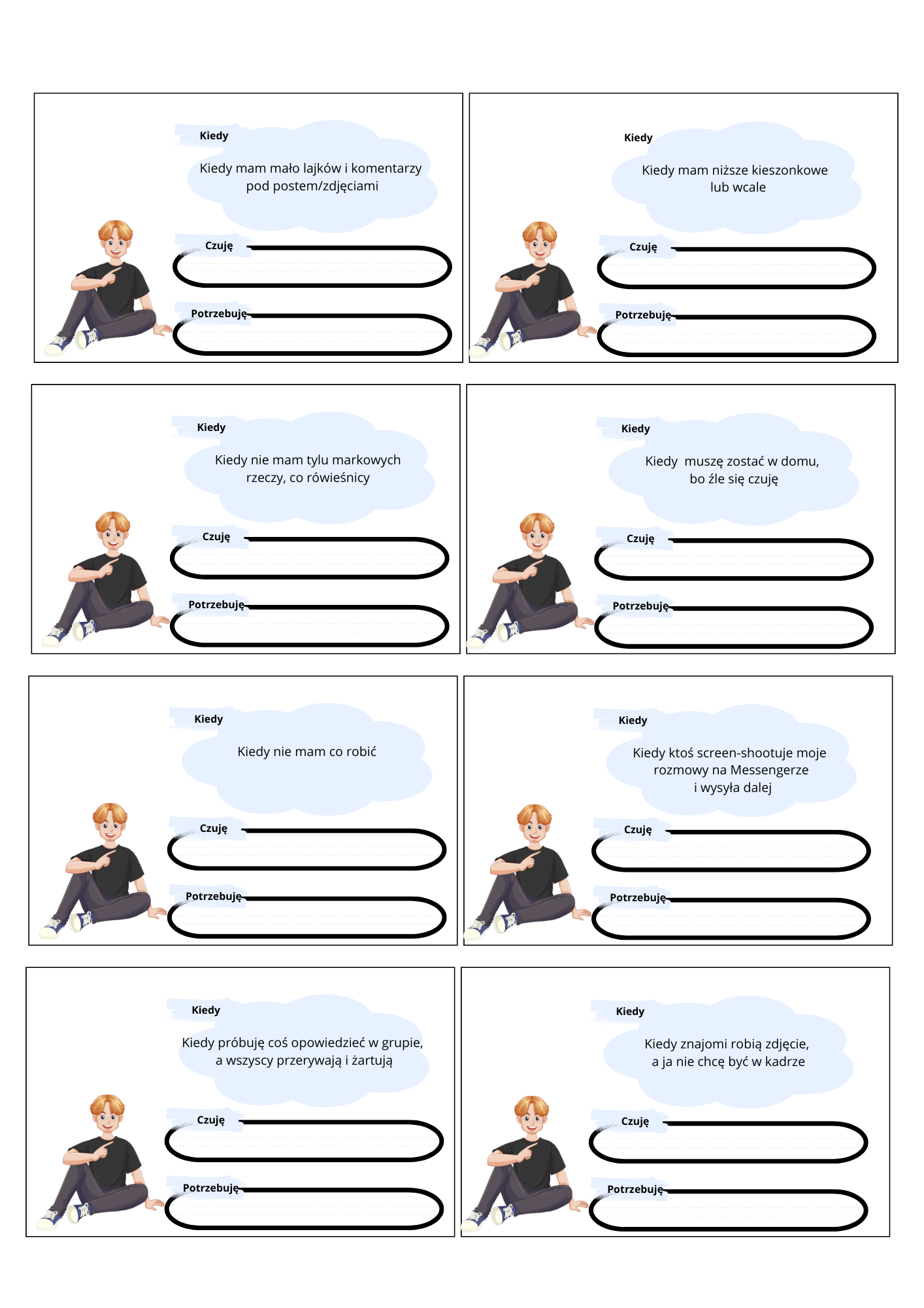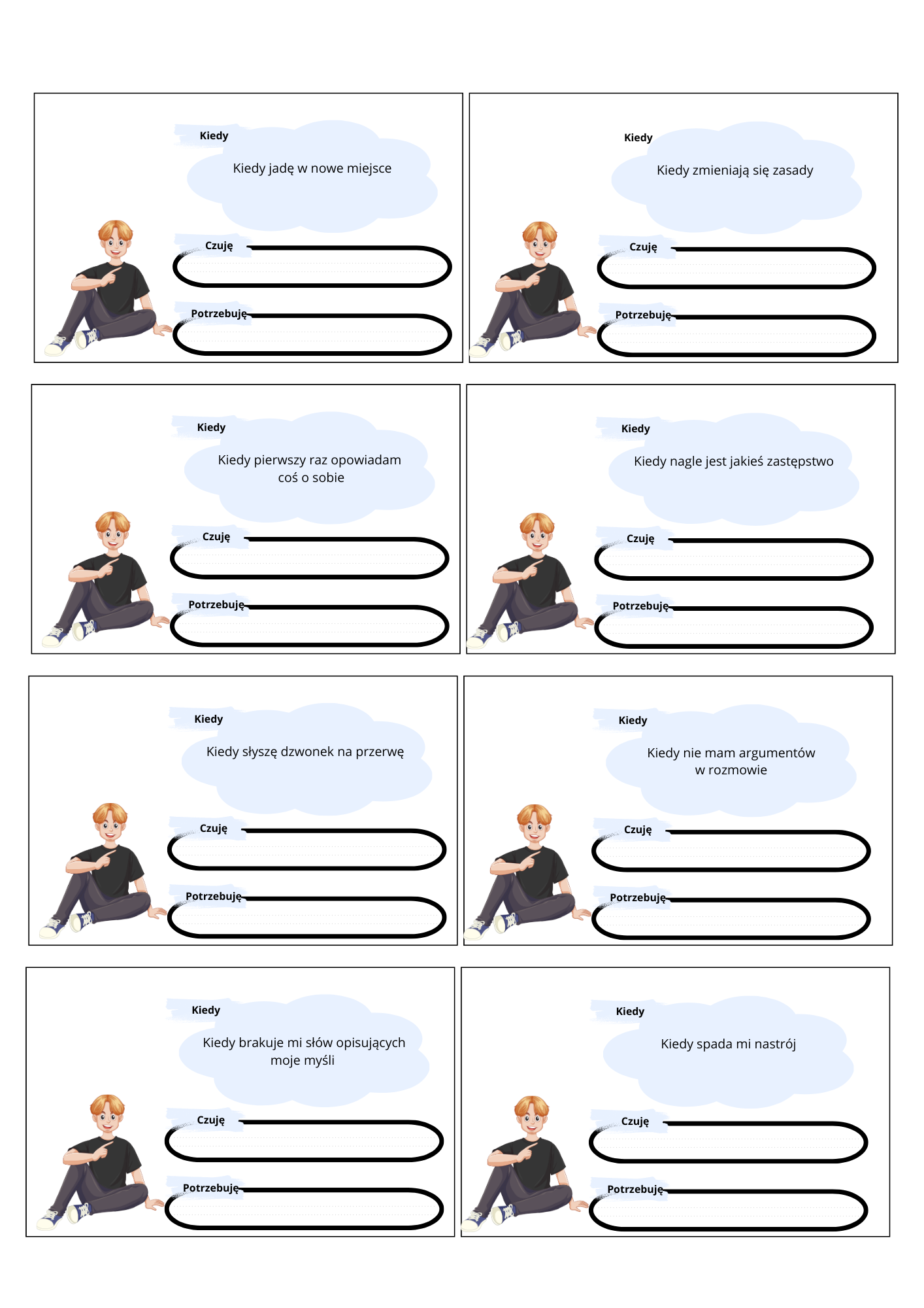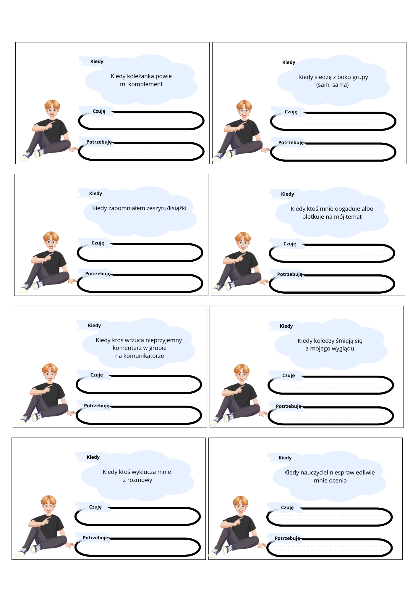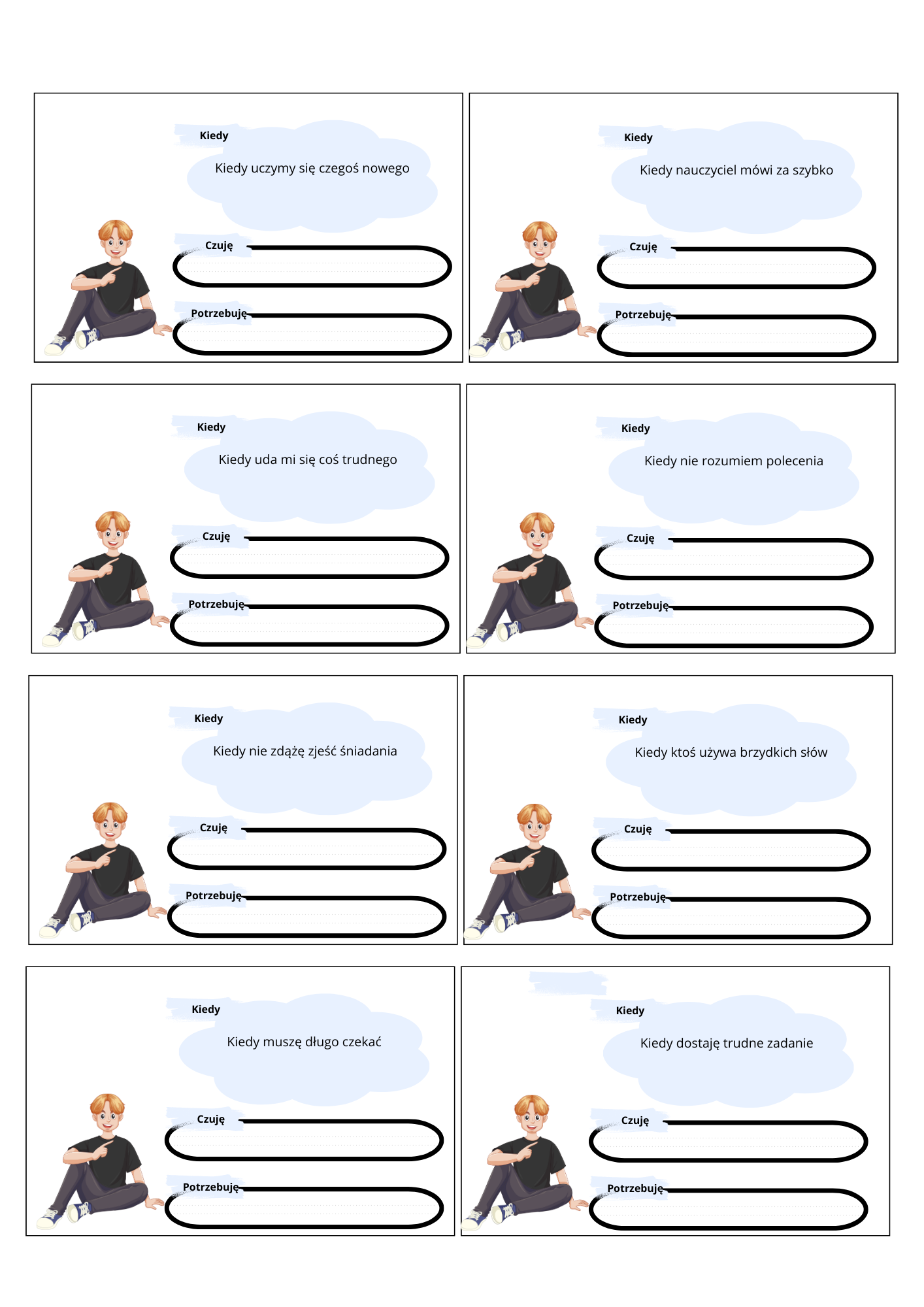 Materiały możesz wydrukować jako "kartę pracy" do wypełnienia przez ucznia lub wydrukować, zalaminować, wyciąć i używać jako kart wielokrotnego użytku.