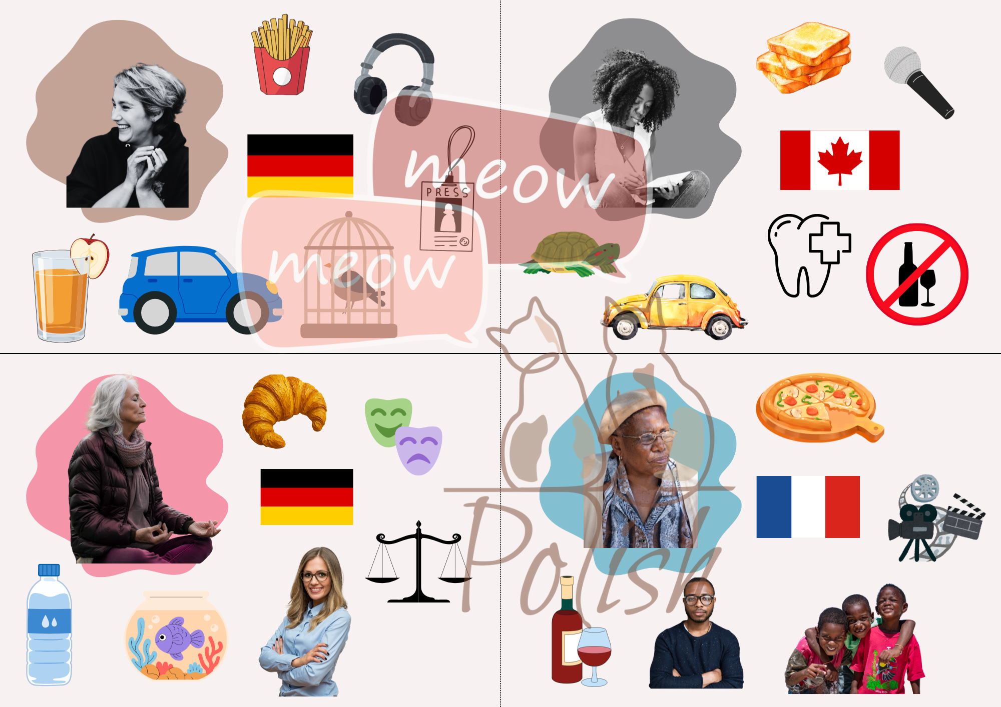 Materiał zawiera 12 kart postaci (6 kobiet, 6 mężczyzn) w dwóch odsłonach: pierwsza ukazuje ich przeszłość, druga natomiast teraźniejszość. Mogą służyć do opisywania postaci - ich wyglądu i zainteresowań, gdzie mieszkały i teraz mieszkają, co lubią jeść i pić, co mieli, a co mają teraz... na kartach nie ma tekstu, dzięki czemu to uczniowie sami mogą wymyślać kolejne zdania.