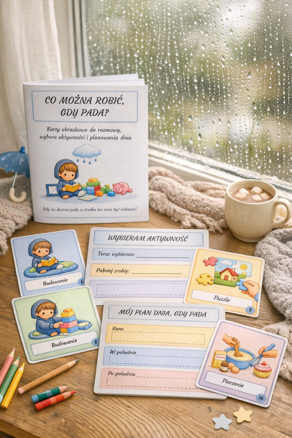 W zestawie znajdują się urocze karty obrazkowe przedstawiające aktywności idealne na deszczowy dzień, takie jak m.in. czytanie, rysowanie, budowanie, śpiewanie, teatrzyk, kino domowe, puzzle, gry planszowe, słuchanie muzyki, malowanie, plastelina, pieczenie czy zabawy sensoryczne 🌈🎨🎵📚