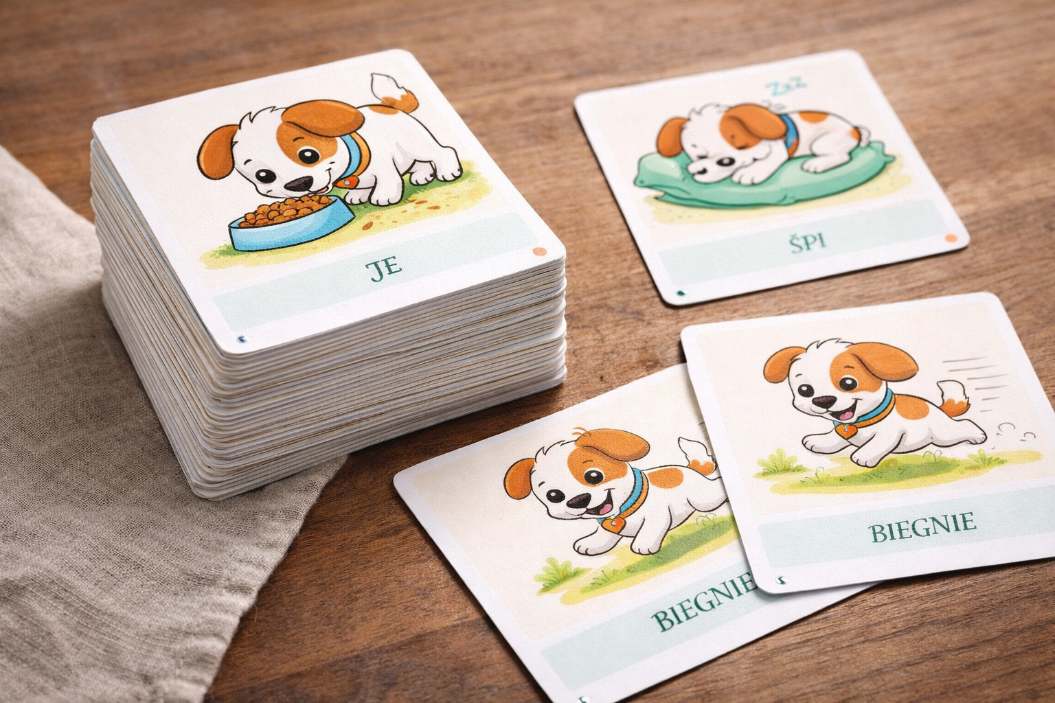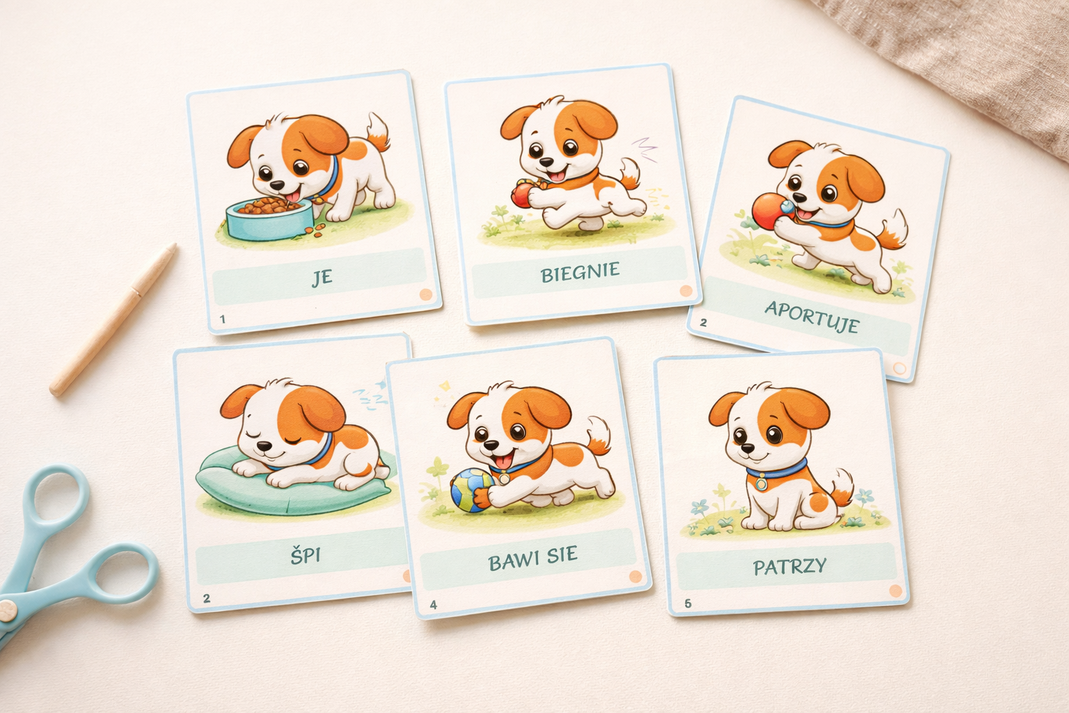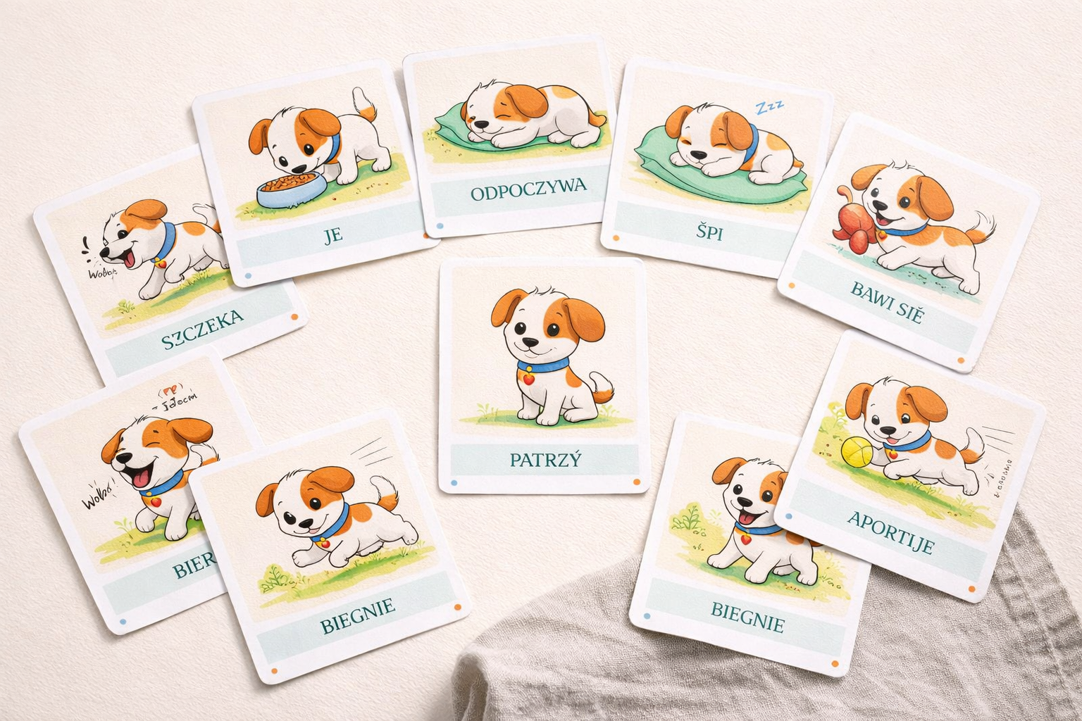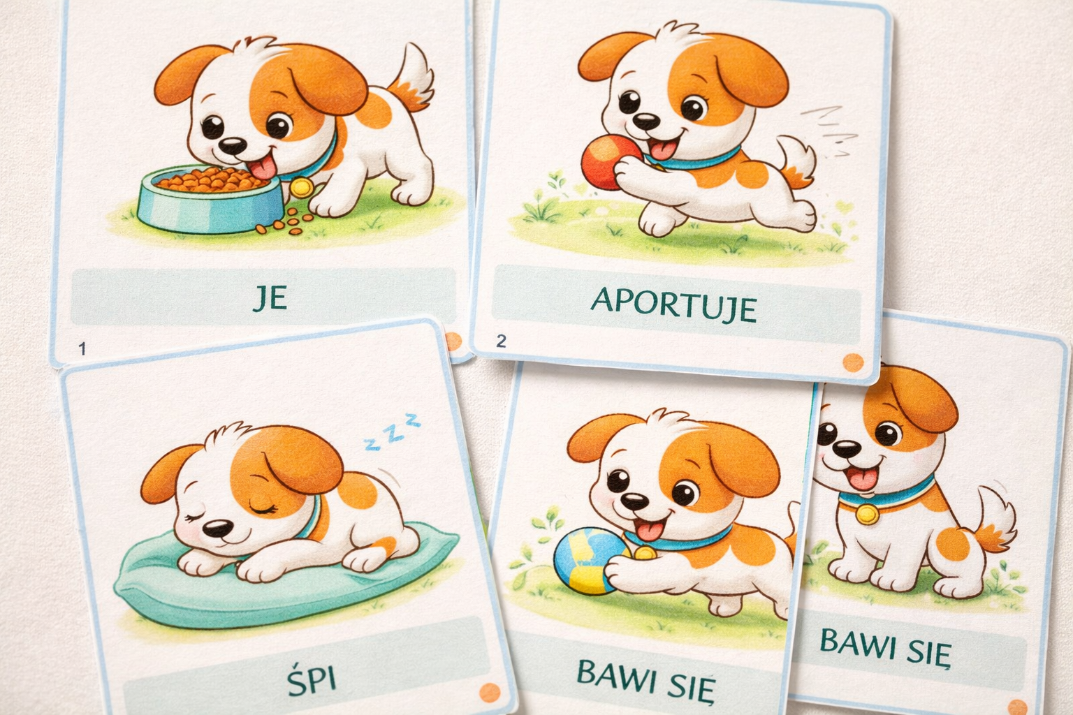 ✔️ 24 karty obrazkowe z czynnościami (np. je, biegnie, śpi, aportuje)