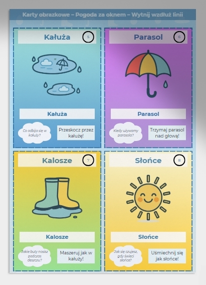📚 Różnorodne zastosowania – nauka słownictwa, zabawy memory, sortowanie pogody, odgrywanie scenek, praca indywidualna i grupowa
