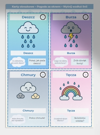 Idealne dla przedszkolaków, uczniów, nauczycieli i rodziców. Karty pomogą dziecku poznać i utrwalić słownictwo związane z pogodą, rozwiną wyobraźnię, a także zachęcą do aktywności ruchowych i zabaw integracyjnych.