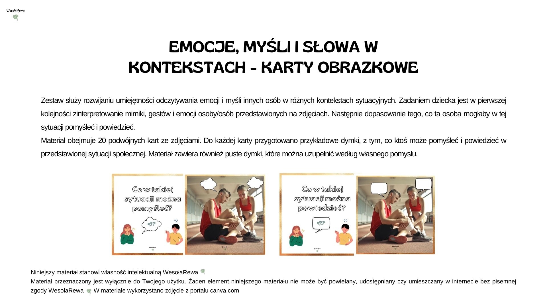 Materiał obejmuje 20 podwójnych kart ze zdjęciami. Do każdej karty przygotowano przykładowe dymki, z tym, co ktoś może pomyśleć i powiedzieć w przedstawionej sytuacji społecznej. Materiał zawiera również puste dymki, które można uzupełnić według własnego pomysłu.