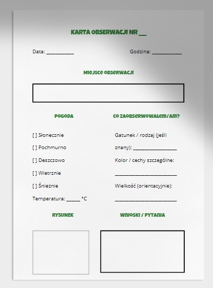 Odkryj fascynujący świat natury z pomocą Kart Obserwacji Przyrodniczych! To kreatywne i praktyczne narzędzie zaprojektowane z myślą o dzieciach, młodzieży i wszystkich miłośnikach przyrody. Karty te umożliwiają systematyczne dokumentowanie obserwacji świata roślin, zwierząt oraz zjawisk atmosferycznych.