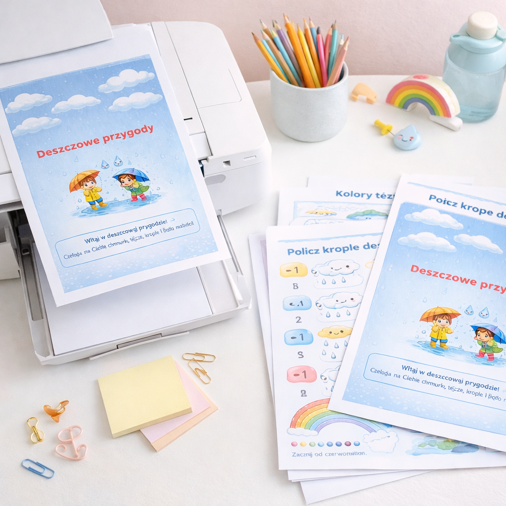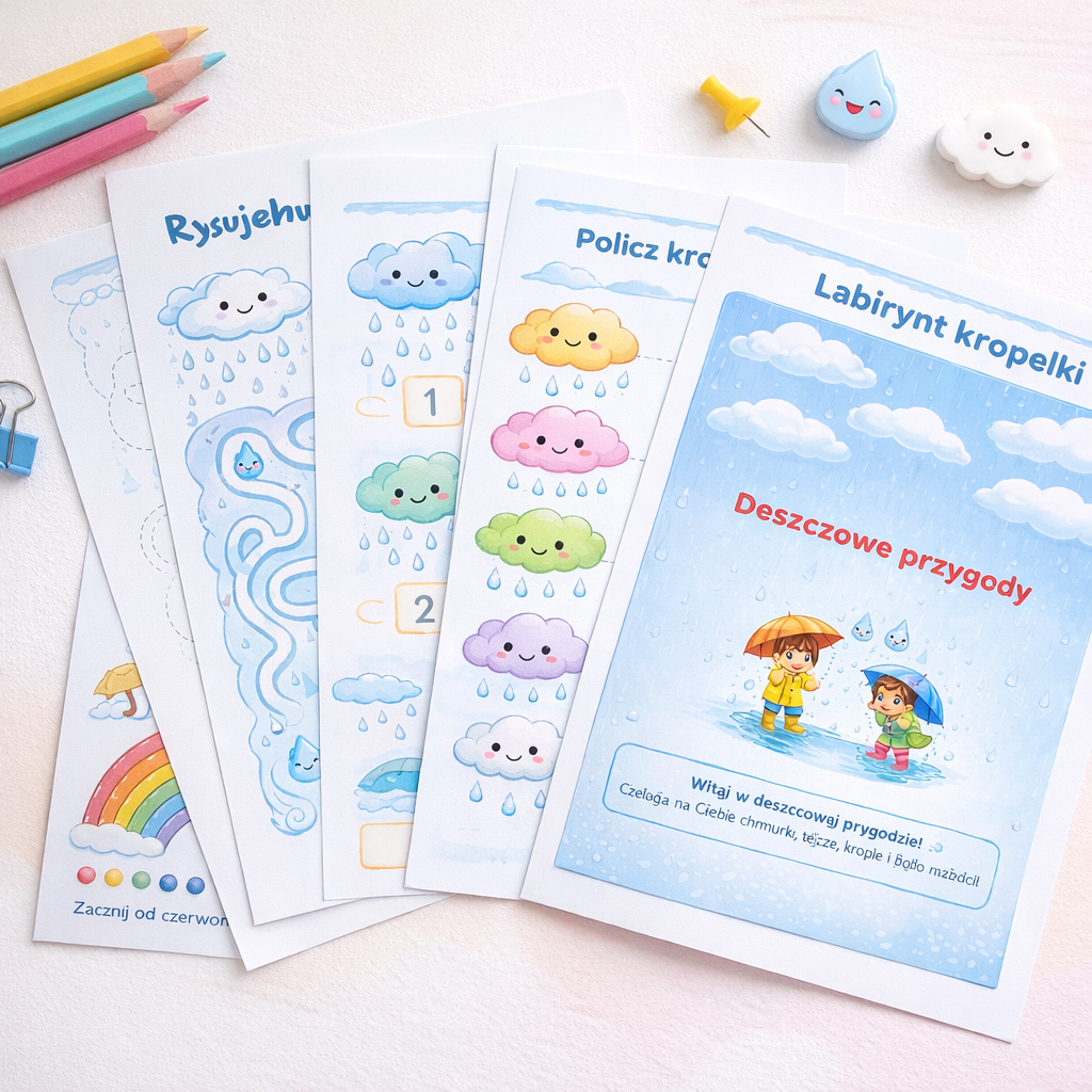 Zanurz się w pełnych koloru i radości „Deszczowych przygodach” – wyjątkowym zestawie kart pracy, który zamieni nawet najbardziej pochmurny dzień w wesołą, edukacyjną przygodę! ☁️👧🧒