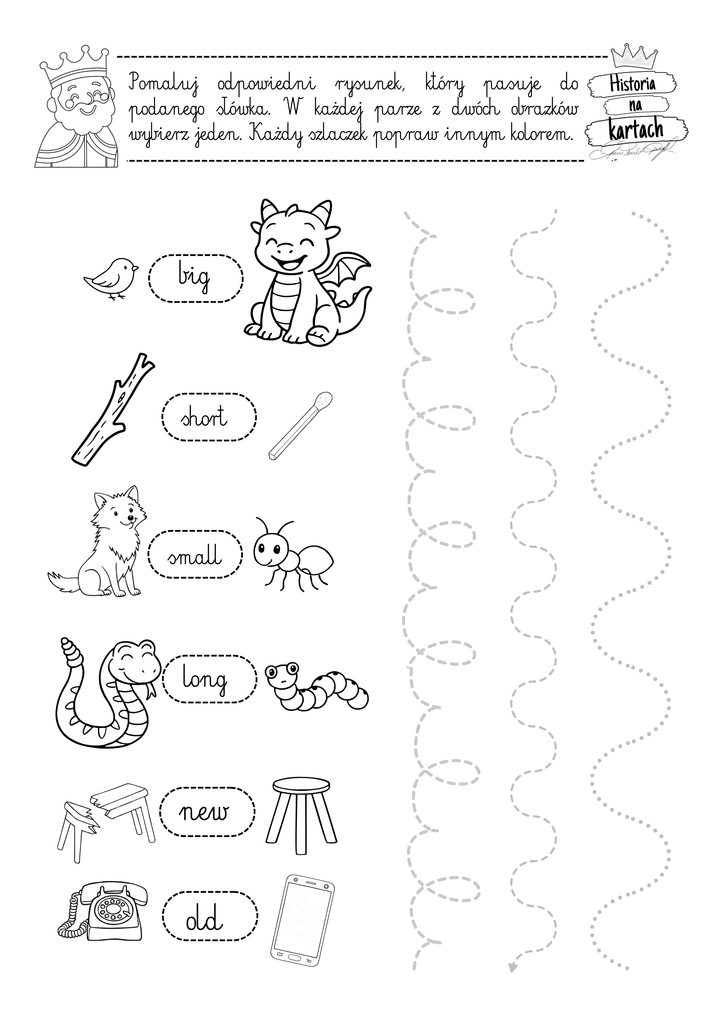 Tym razem przygotowałem karty pracy łączące język angielski z ćwiczeniami grafomotorycznymi. Być może przydadzą się Wam na zajęciach powtórzeniowych lub jako zajęcie dla uczniów, którzy szybciej skończyli dane zadanie. Zapraszam do bezpłatnego pobrania w wygodnym pliku pdf :)))