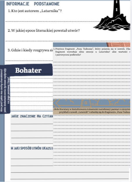 Karta pracy do „Latarnika” Henryka Sienkiewicza z odniesieniami do „Pana Tadeusza” została przygotowana dla uczniów klasy 8, z myślą o powtórzeniu materiału i przygotowaniu do egzaminu ósmoklasisty. Zawiera pytania dotyczące autora, epoki, bohaterów, wydarzeń i znaczenia utworu. Szczególną uwagę poświęcono analizie fragmentu „Pana Tadeusza” w kontekście życia bohatera oraz symboliki roli latarnika. Karta kończy się zadaniem twórczym – przygotowaniem argumentu do rozprawki o roli literatury w kształtowaniu tożsamości narodowej i pamięci o ojczyźnie, co rozwija umiejętność łączenia tekstów literackich i formułowania własnych wniosków.