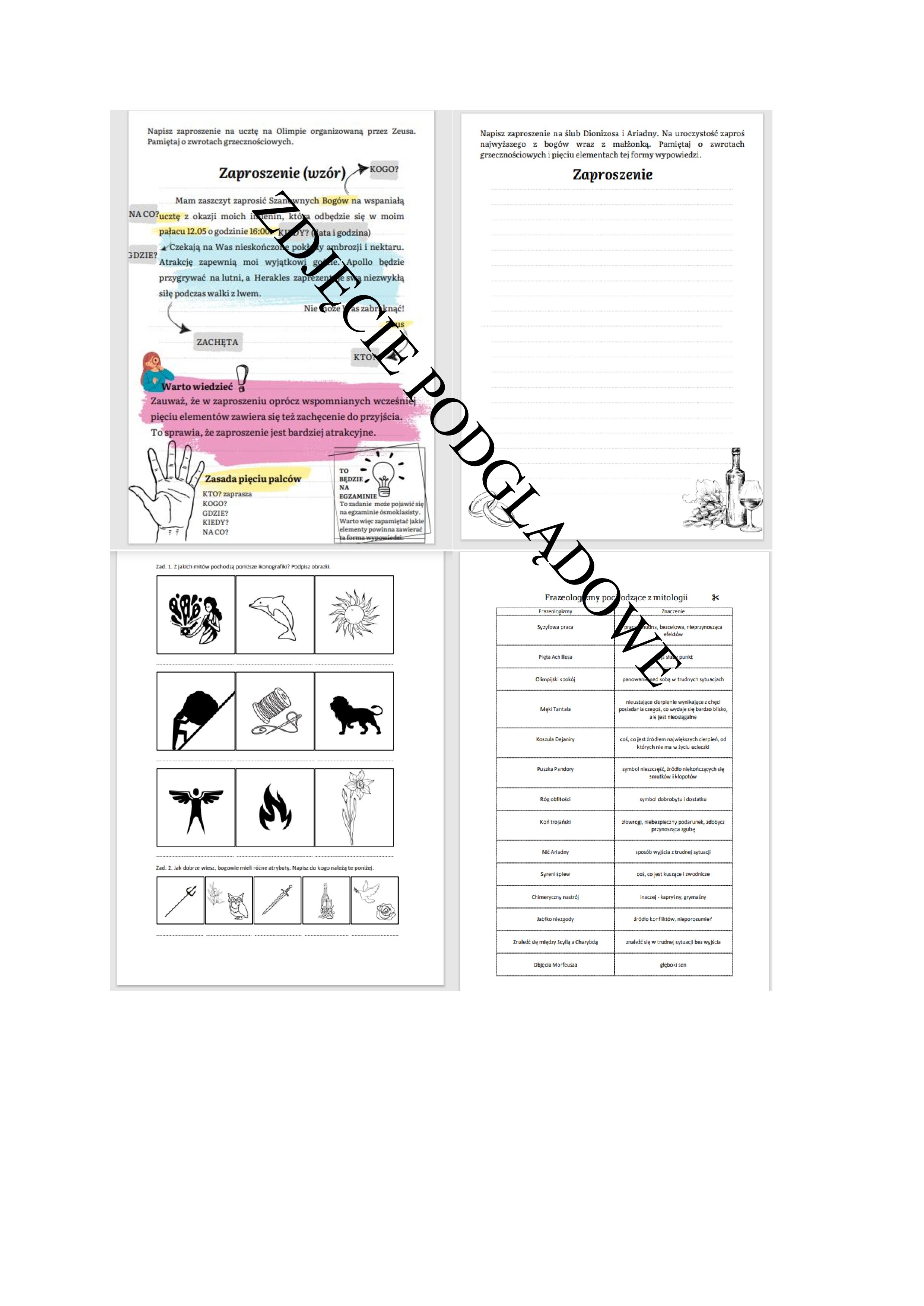 Plik zawiera cztery karty pracy: - zaproszenie (wzór) - zaproszenie do napisania przez ucznia (nawiązujące do mitów greckich) - karty ze związkami frazeologicznymi z mitologii - kartę z ikonografikami nawiązującymi do mitów