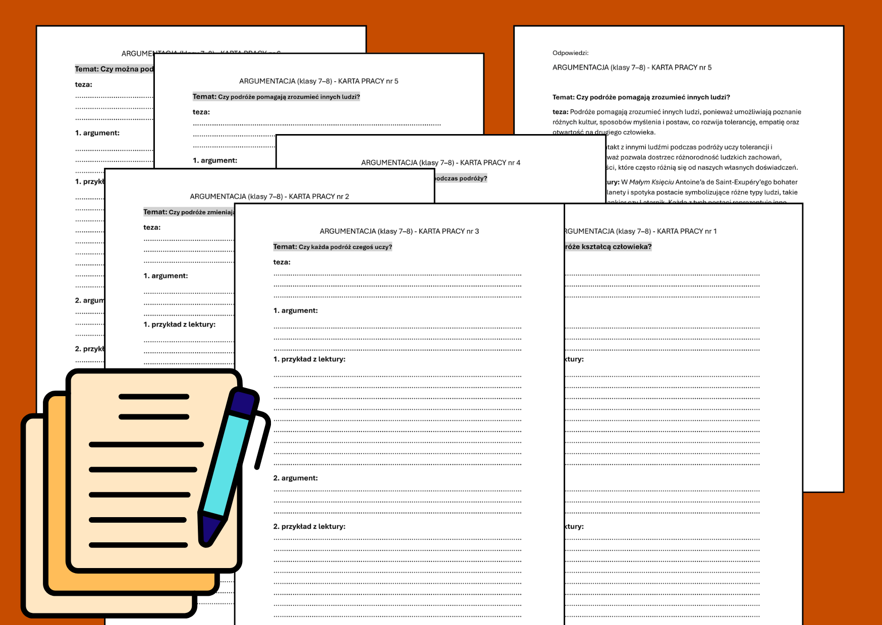 Te karty pracy to gotowe narzędzie do ćwiczenia najważniejszych umiejętności: tworzenia tezy, budowania argumentów i dobierania przykładów z lektur.