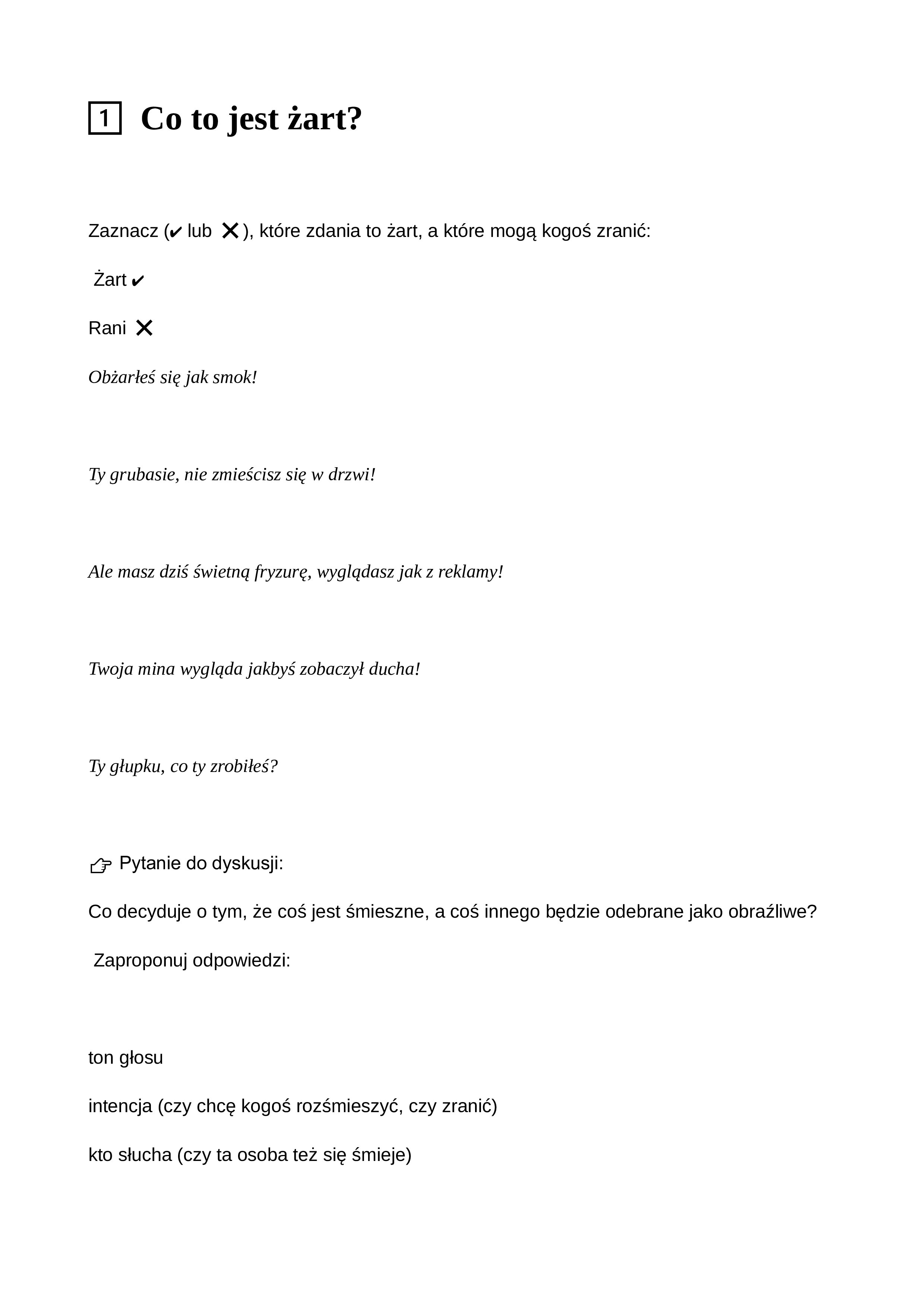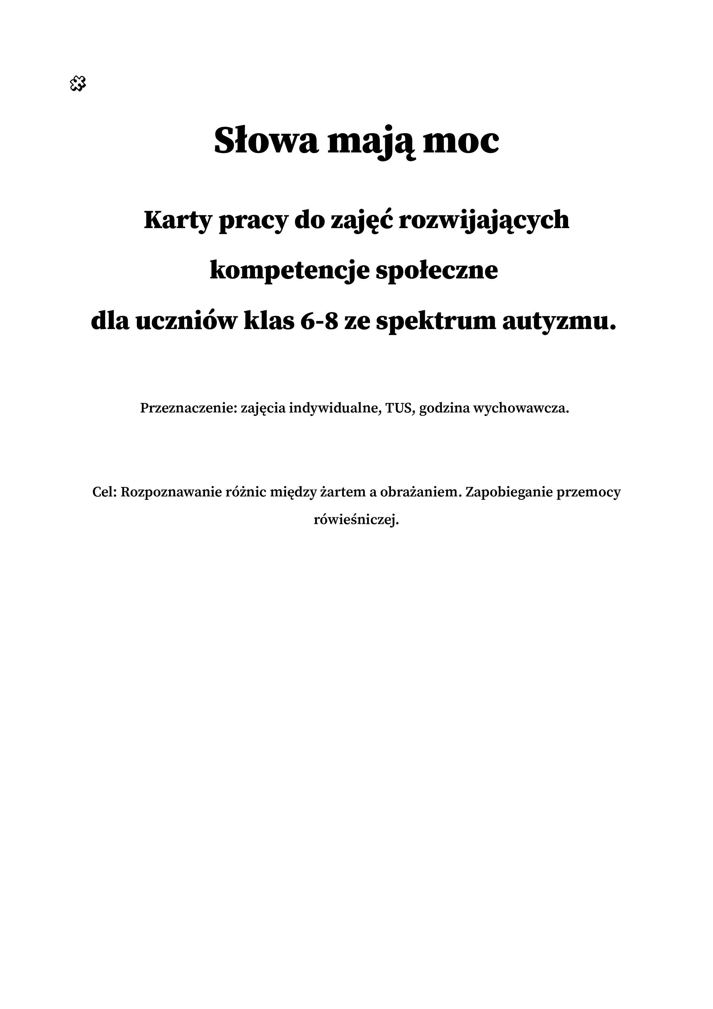 Zajęcia rozwijające kompetencje społeczne. Rozwijanie umiejętności odróżniania niewinnych żartów od obrażania. Materiał przeznaczony dla uczniów klas 4-8 ze spektrum autyzmu, zawiera 5 kart pracy, pytania zamknięte oraz otwarte, pytania do dyskusji.