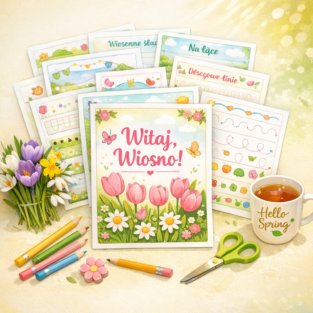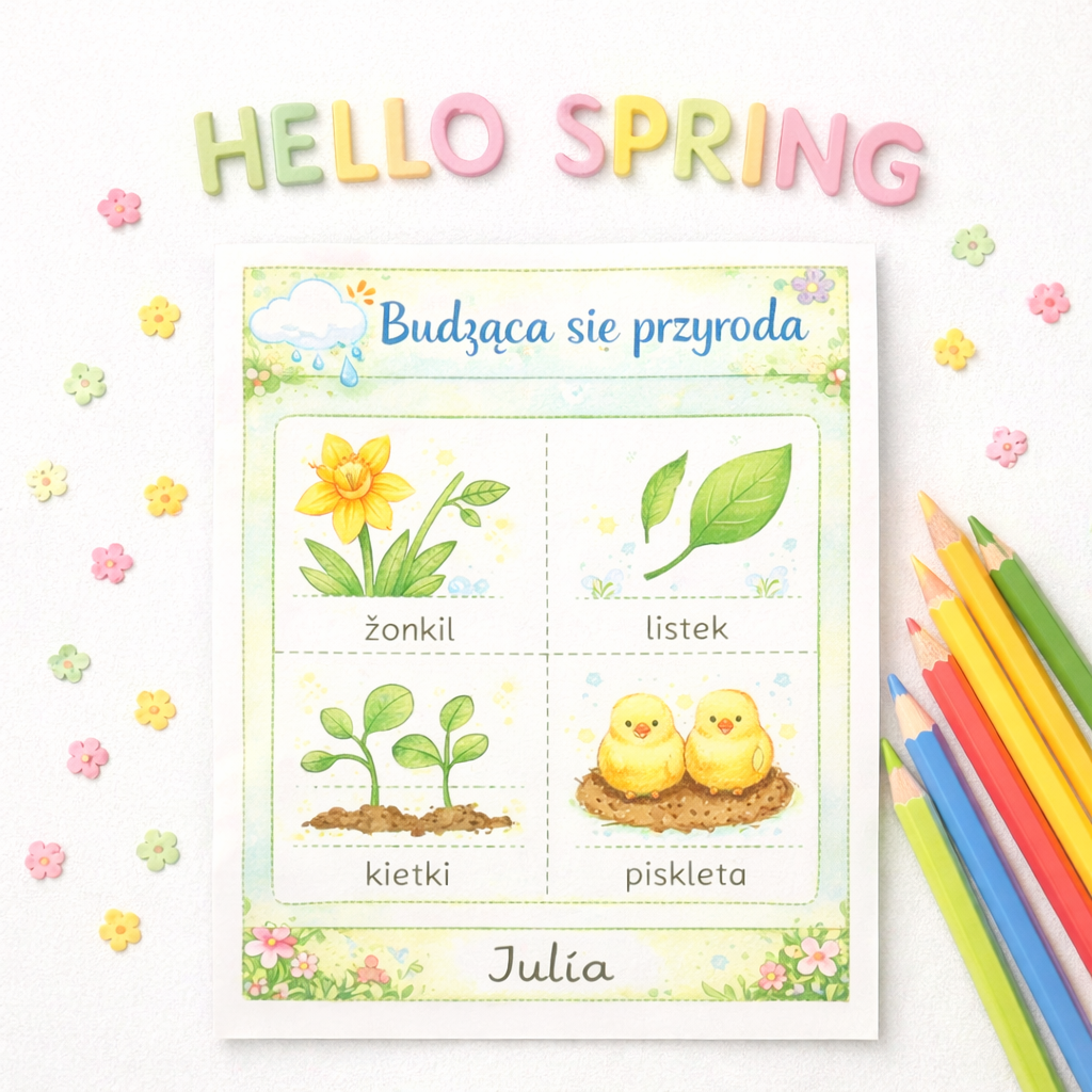Zestaw 10 pięknych, kolorowych kart pracy „Wiosna tuż-tuż” to gotowy materiał edukacyjny, który wprowadzi dzieci w magiczny świat budzącej się przyrody 🌿🦋.