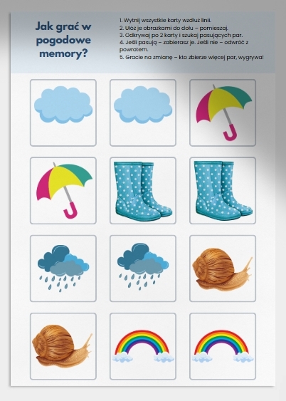 🧠 Gra memory – Pogodowe pary – gotowa do wycięcia gra rozwijająca pamięć i koncentrację. Obrazki przedstawiają m.in. chmurki, parasolki, kalosze, tęczę i ślimaka 🐌🌈☁️ – idealna do nauki słownictwa i zabawy w grupie!