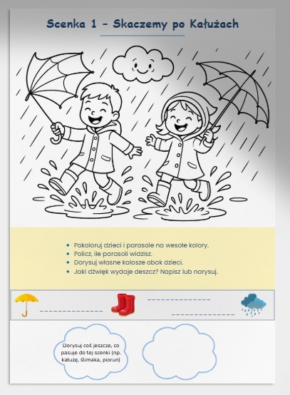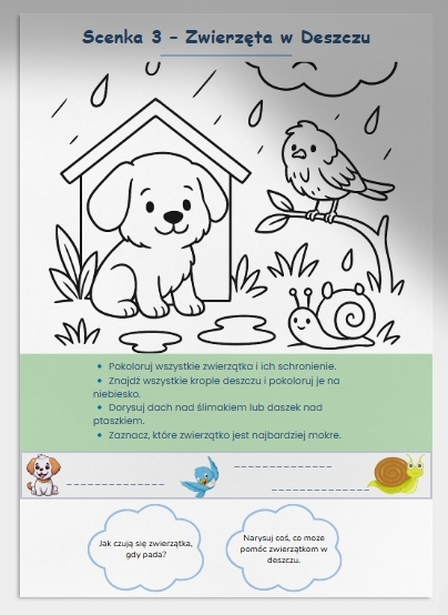 🎨 Scenki do kolorowania z zadaniami – aż 5 uroczych ilustracji przedstawiających przygody dzieci i zwierzątek podczas deszczowej pogody. Każda scenka zawiera: