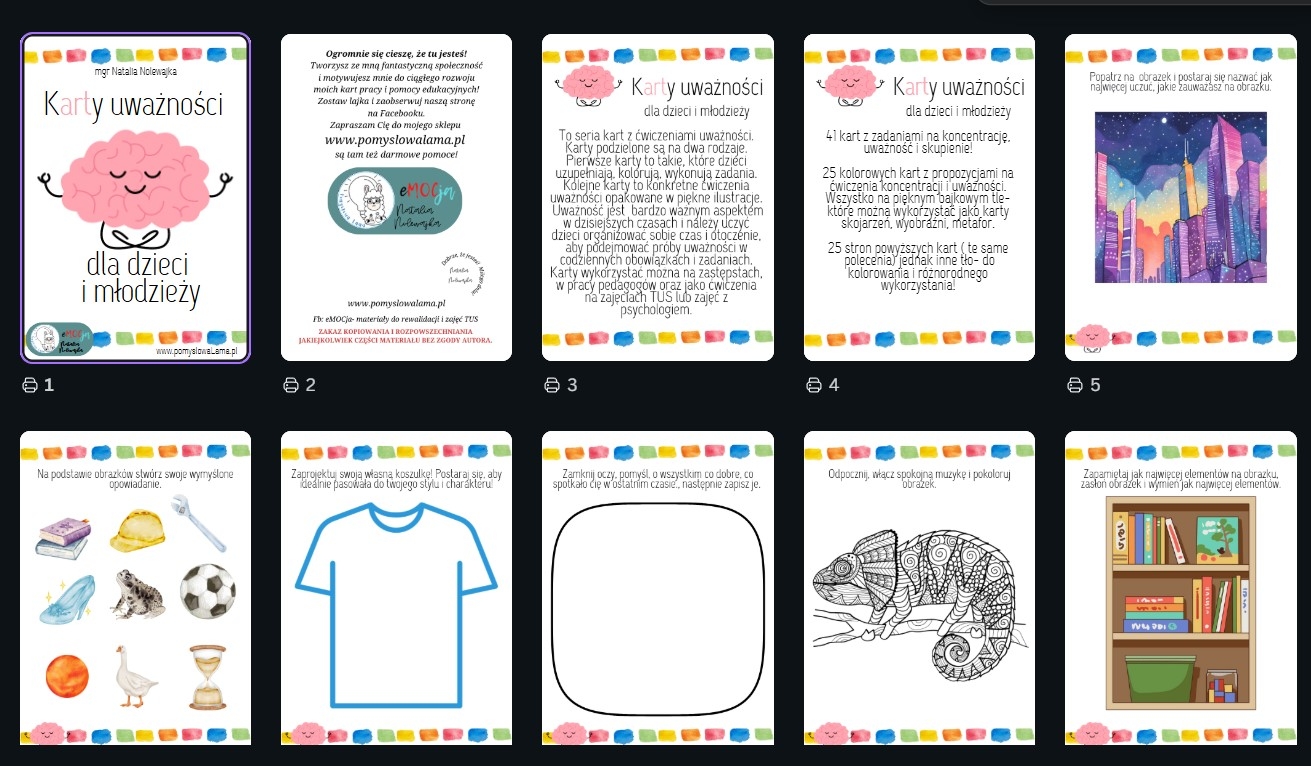 To seria kart z ćwiczeniami uważności. Karty podzielone są na dwa rodzaje. Pierwsze karty to takie, które dzieci uzupełniają, kolorują, wykonują zadania. Kolejne karty to konkretne ćwiczenia uważności opakowane w piękne ilustracje. Uważność jest bardzo ważnym aspektem w dzisiejszych czasach i należy uczyć dzieci organizować sobie czas i otoczenie, aby podejmować próby uważności w codziennych obowiązkach i zadaniach. Karty wykorzystać można na zastępstwach, w pracy pedagogów oraz jako ćwiczenia na zajęciach TUS lub zajęć z psychologiem.