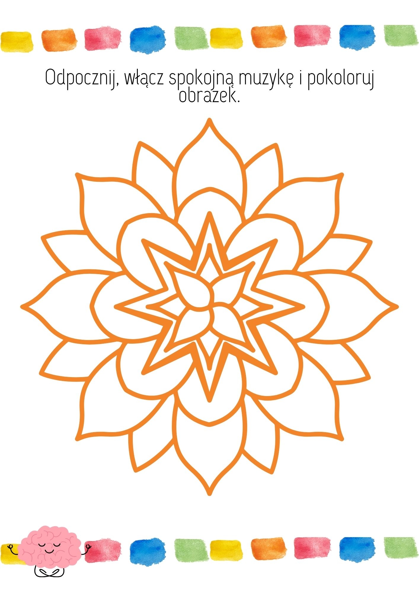 Czarno- biała forma sprawdzi się jako zadanie domowe, czyli do pokolorowania i przetestowania! Każdy pokolorowany obrazek to wykonana i przećwiczona forma uważności i koncentracji. Dodatkowo możecie rozdać karty dzieciom, każde dziecko testuje daną metodę, a następnie opowiada o niej innym. Kolejnym pomysłem może być stworzenie własnej kolorowej gazetki z różnymi propozycjami ćwiczeń na koncentrację i uważność.