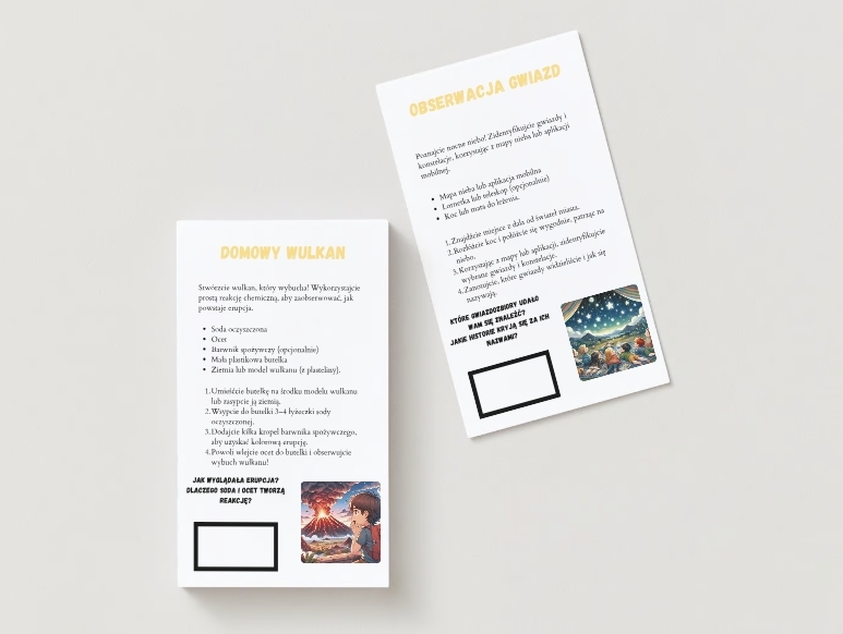 - 5 kart naukowych: np. „Domowy Wulkan” czy „Eksperyment z Tęczą”.