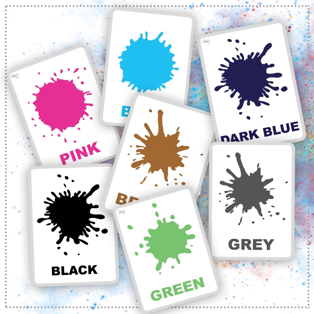 Karty do nauki kolorów w języku angielskim. Zestaw obejmuje 11 kolorów: black, brown, dark blue, blue, orange, yellow, green, red, purple, pink, grey.
