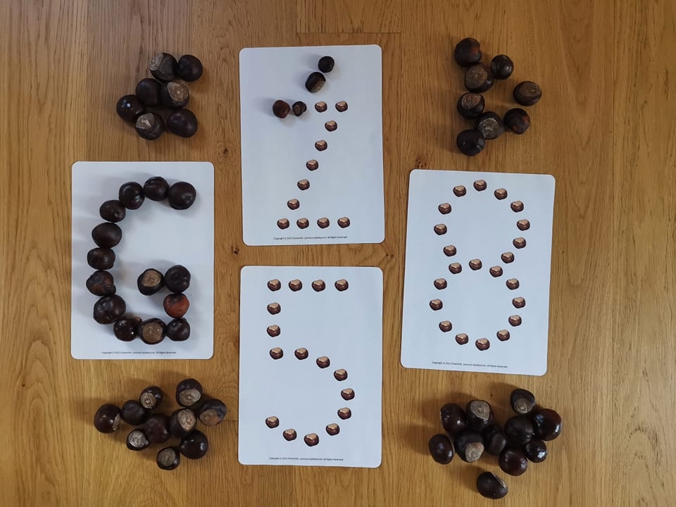 Zabawy z kasztanami ćwiczą motorykę małą oraz dużą. Nadają się dla dzieci młodszych a także starszych. Zadaniem dziecka jest ułożenie kasztanów na kartach.