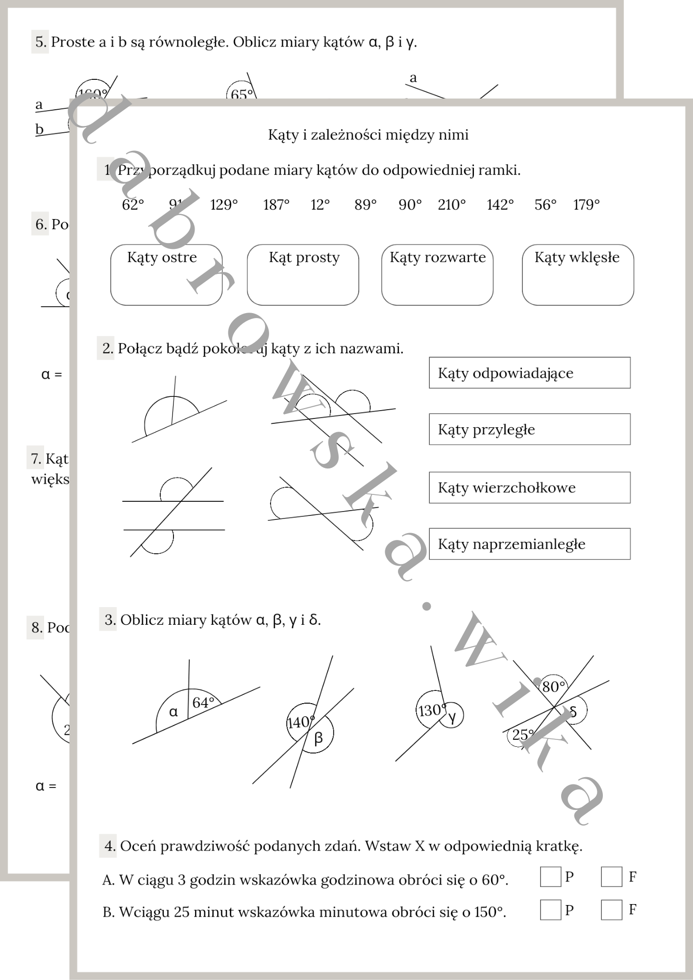 Składa się ona z ośmiu zadań, które mają na celu sprawdzenie umiejętności rozpoznawania różnych rodzajów kątów, obliczania ich miar oraz znajomości relacji między nimi.