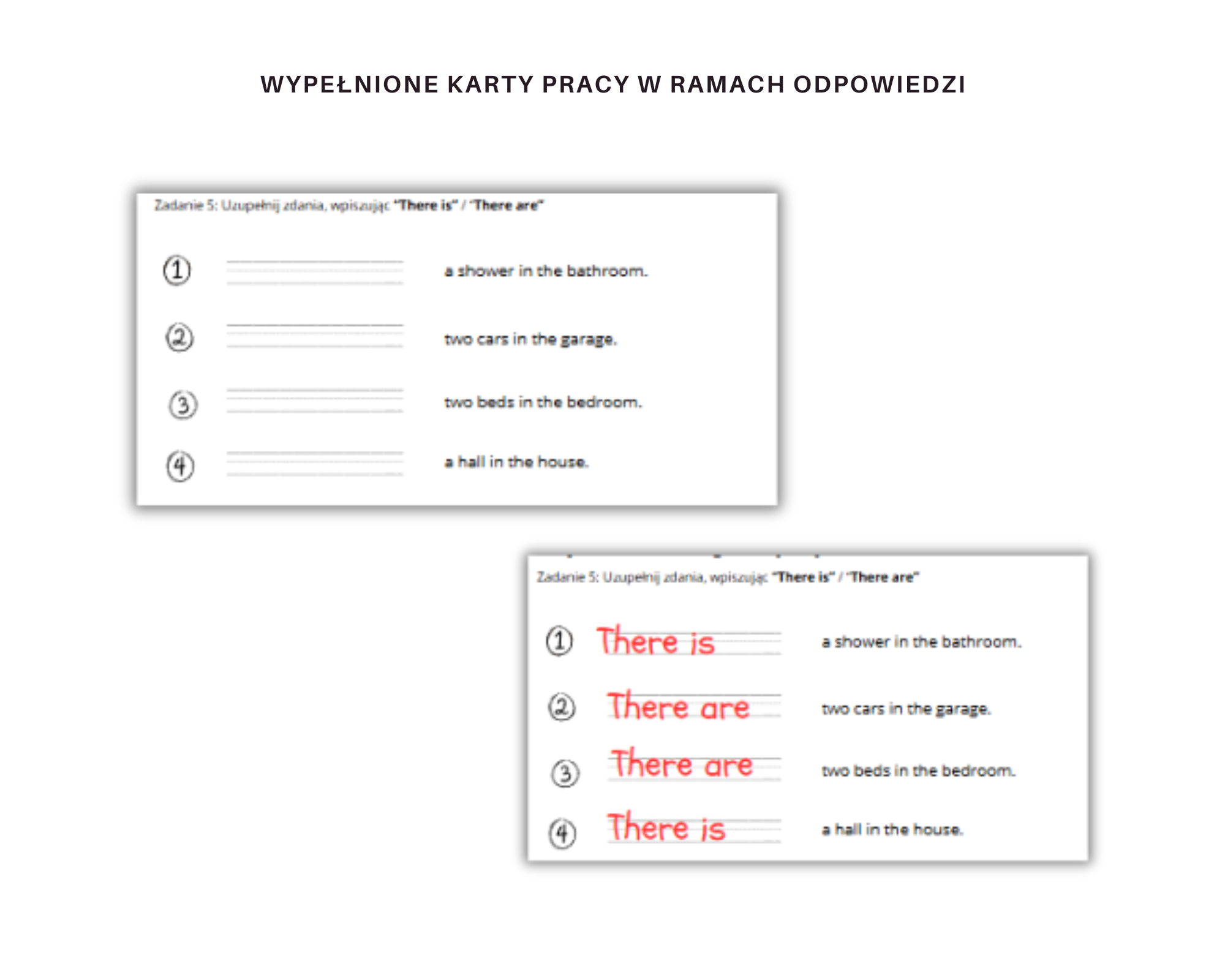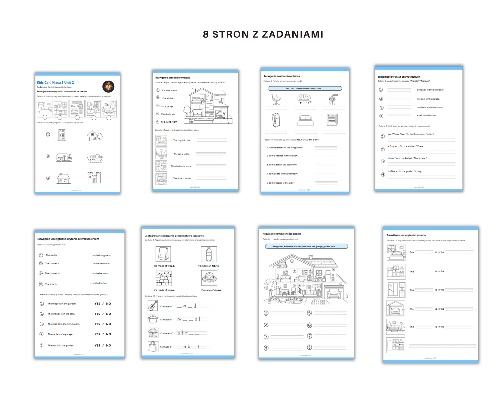 Zadania zostały opracowane na podstawie materiału z drugiego działu, który koncentruje się na słownictwie i zwrotach związanych z domem (rodzaje domów, nazwy pomieszczeń oraz tworzyw z jakich przedmioty są wykonane ) + plus strukturze gramatycznej There is / There are w zadaniach twierdzących.