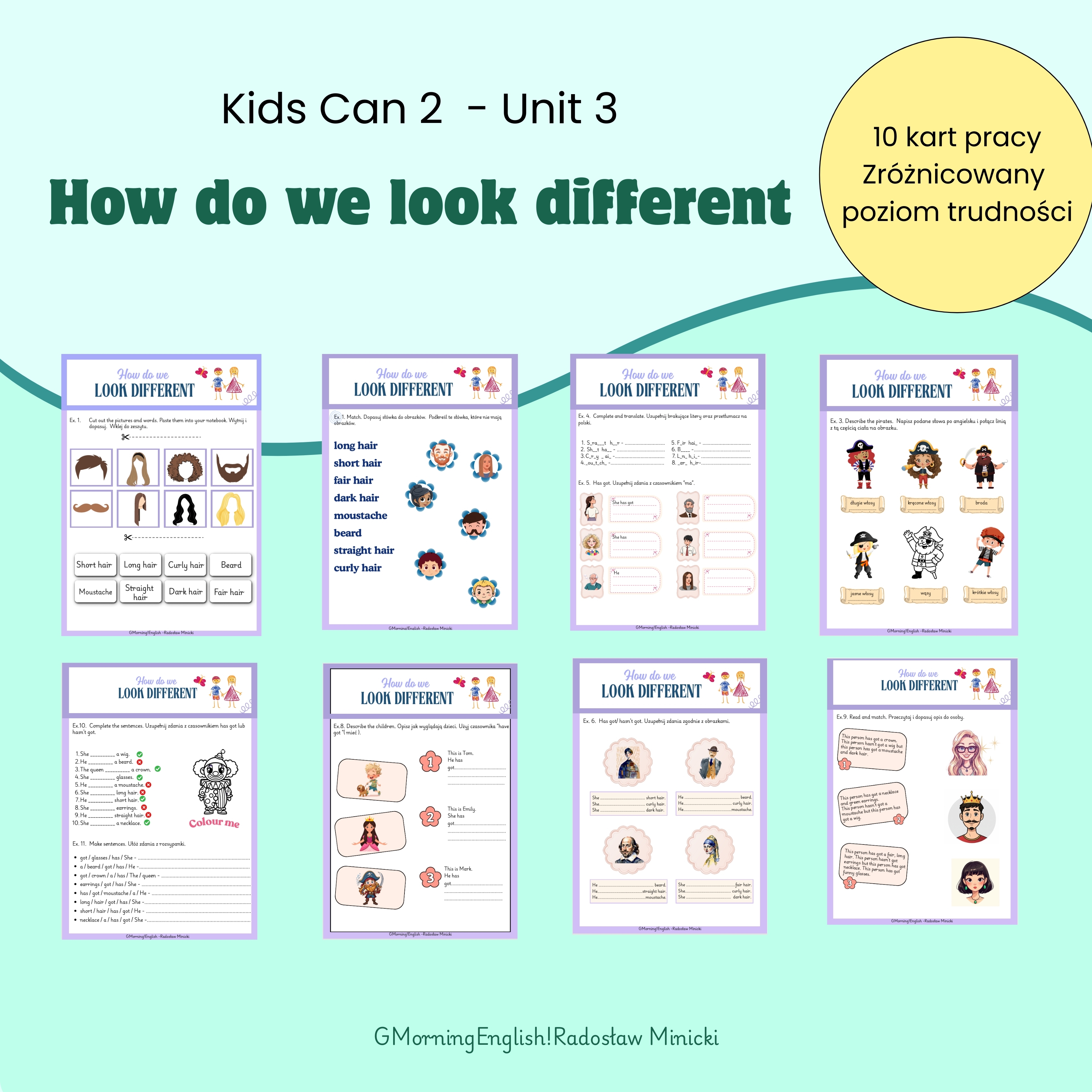✨ Nowy materiał do Kids Can 2 – Unit 4 „How do we look different?” ✨ Przygotowałam zestaw prostych i przyjaznych zadań dla uczniów klasy 3, idealnie dopasowanych do podręcznika Kids Can 2, Unit 4. Materiał pomaga dzieciom utrwalić słownictwo i konstrukcję has got / hasn’t got w kontekście opisu wyglądu. 📘 Co znajdziesz w środku? ✔️ uzupełnianie zdań (has got / hasn’t got) ✔️ rysowanie na podstawie tekstu ✔️ rozsypanki wyrazowe ✔️ krótkie teksty opisujące dzieci ✔️ ćwiczenia na słownictwo: hair, eyes, glasses, beard, moustache, earrings, necklace, wig, crown 🧒👧 Zadania są krótkie, czytelne i dostosowane do możliwości młodszych uczniów. Świetnie sprawdzą się na lekcji, do pracy samodzielnej lub jako utrwalenie materiału. 💛 Jeśli szukasz gotowego wsparcia do Unit 4 – How do we look different?, które oszczędzi Twój czas i spodoba się dzieciom — ten materiał jest właśnie dla Ciebie.