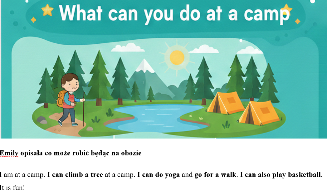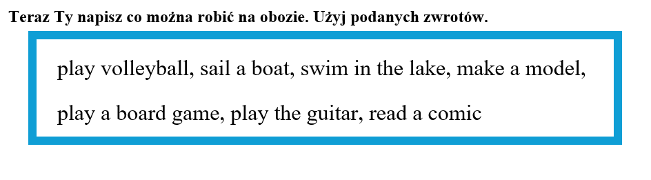 Kart pracy do podręcznika Kids Can 2 unit 5 zawierają dokładny opis i zasady budowy zdań twierdzących, przeczących i ptających z użyciem czasownika "can", a także krótkie odpowiedzi. Zadania ćwiczą słownictwo: play volleyball, sail a boat, swim in the lake, make a model, play a board game, play the guitar, read a comic, climb a tree, do yoga, go for a walk, play basketball, play table tennis.