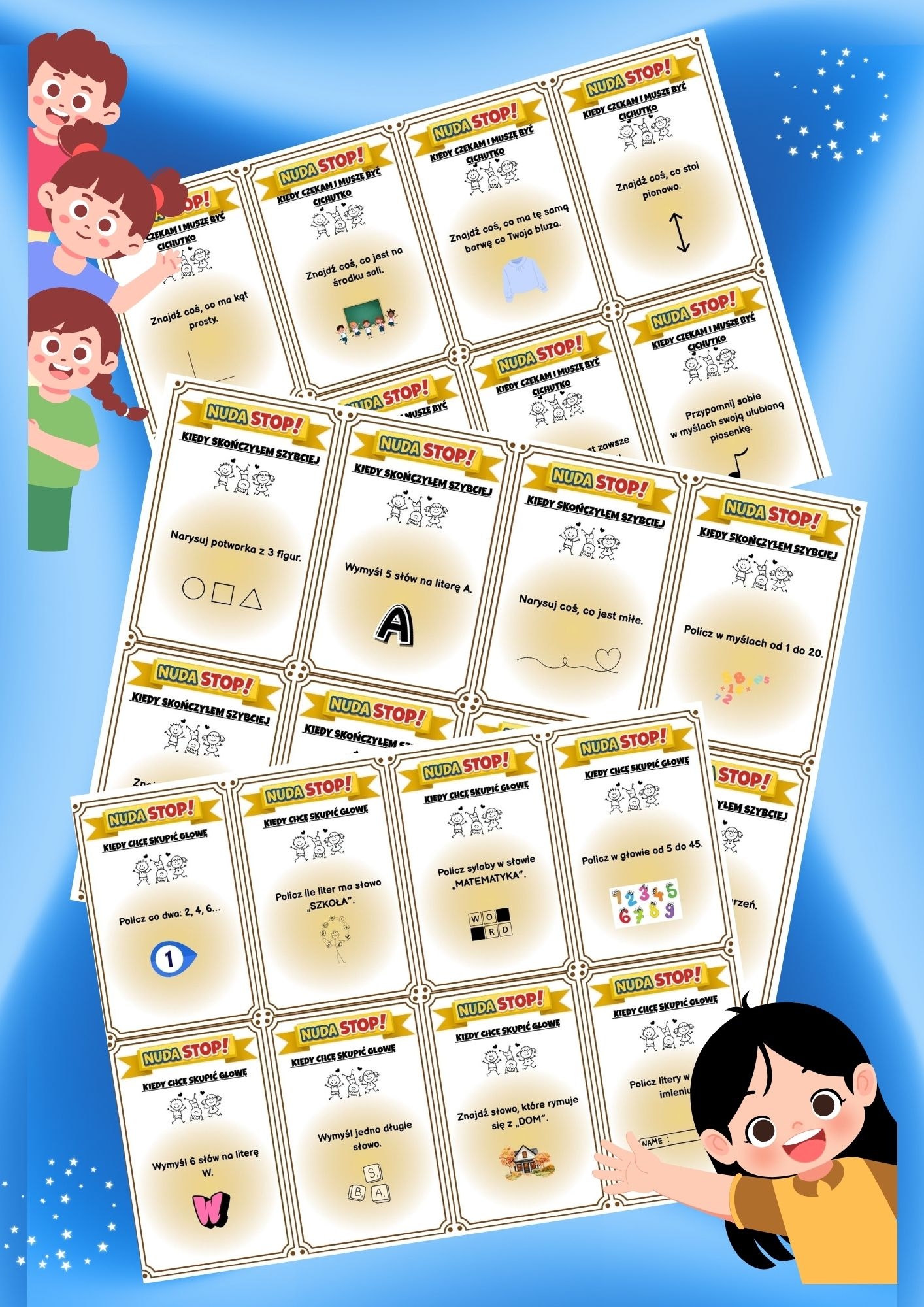Pakiet zawiera 4 czytelne kategorie, po 50 kart w każdej: