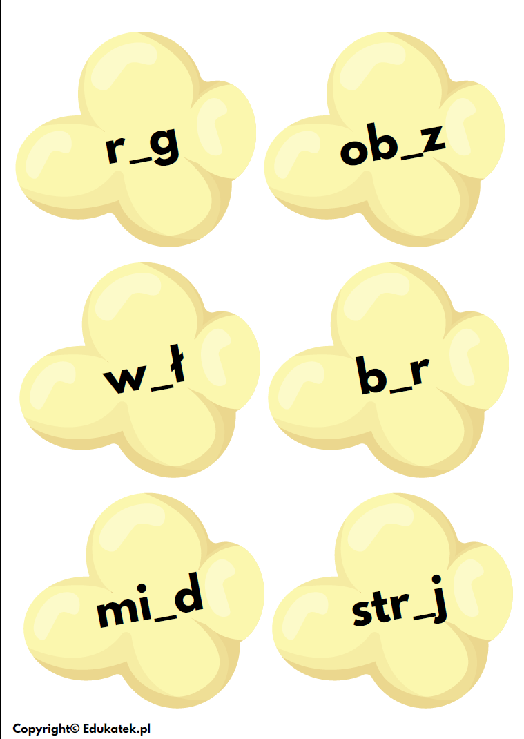 Zestaw liczy 56 stron do samodzielnego wydrukowania, w tym 6 stron zawierających ilustracje opakowania popcornu z daną trudnością np. ch oraz 50 stron z mniejszymi popcornami, na których zapisane są wyrazy zawierające daną trudność. Łącznie zestaw liczy 300 wyrazów – po 50 z każdą trudnością ortograficzną. Zabawa ma bardzo dużo możliwości wykorzystania podczas zajęć.