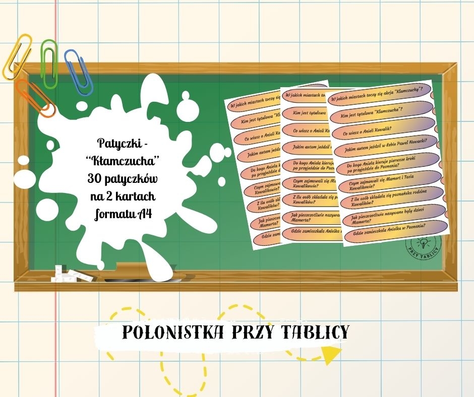 Materiał zawiera dwie strony formatu A4 z pytaniami do "Kłamczuchy". Pytania umieszczone są na “patyczkach”. Można wydrukować, wyciąć i nakleić na patyczki laryngologiczne lub wydrukować, zalaminować i wyciąć. Uczniowie losują pytanie dla siebie lub kolegi/koleżanki.