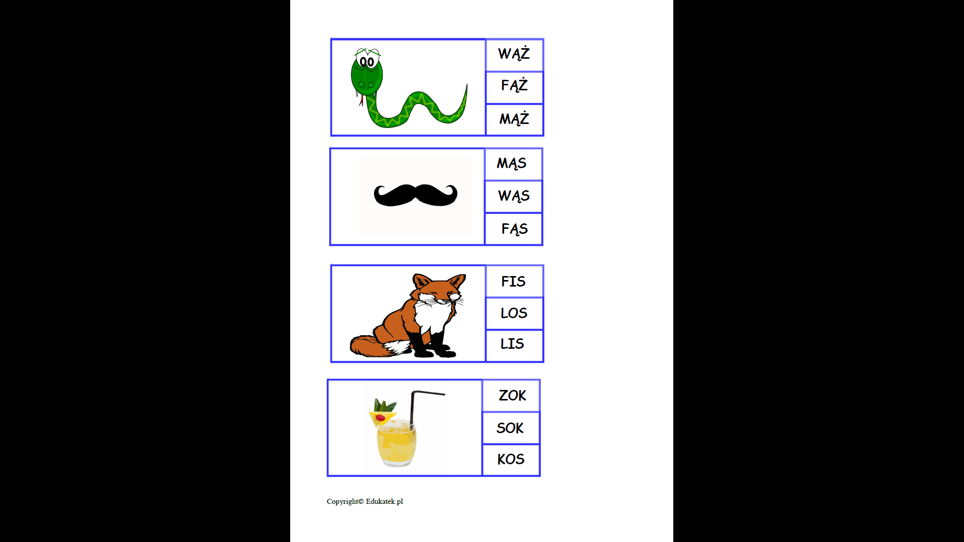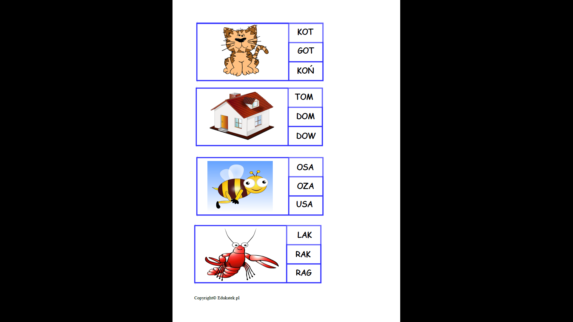 W skład zestawu wchodzi 40 kart do samodzielnego wydrukowania (20 dotyczy wyrazów 3 literowych, kolejne 20 – 4 literowych). Każda karta zawiera obrazek wraz z trzema wyrazami. Tylko jeden zapis jest poprawny.