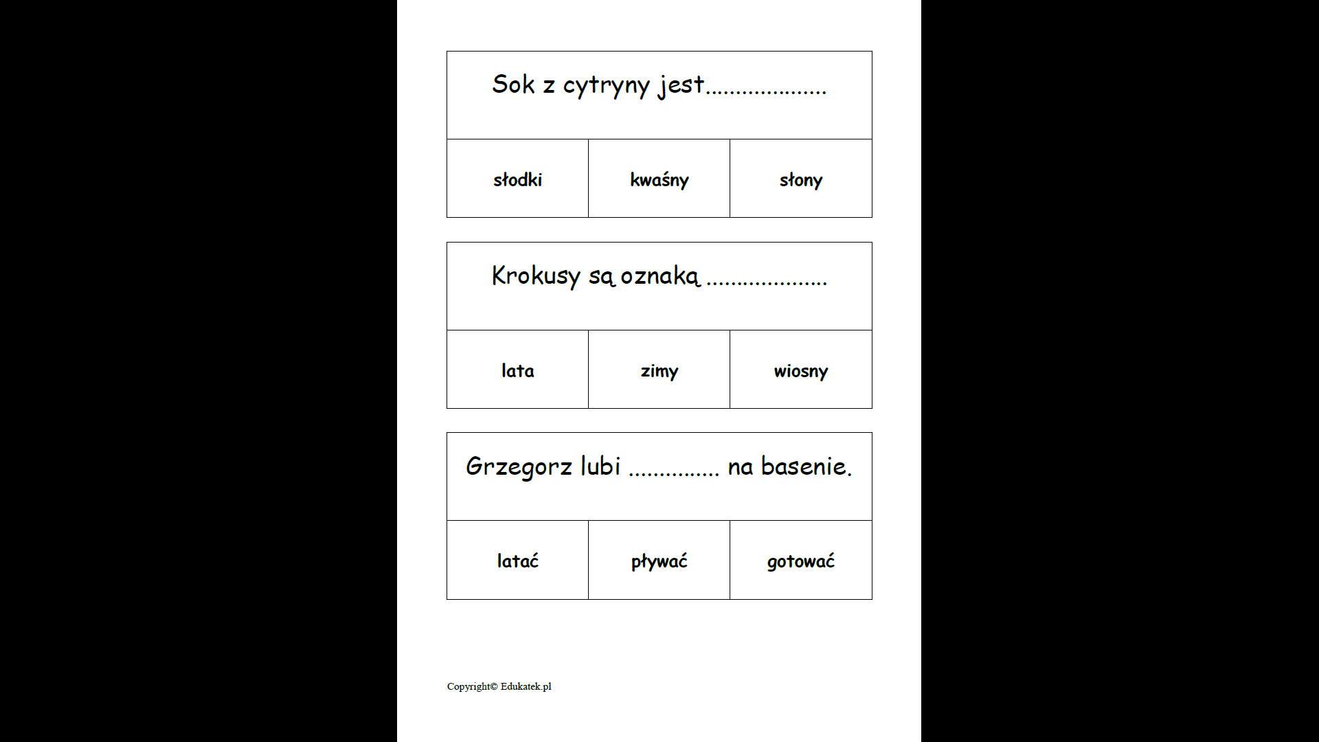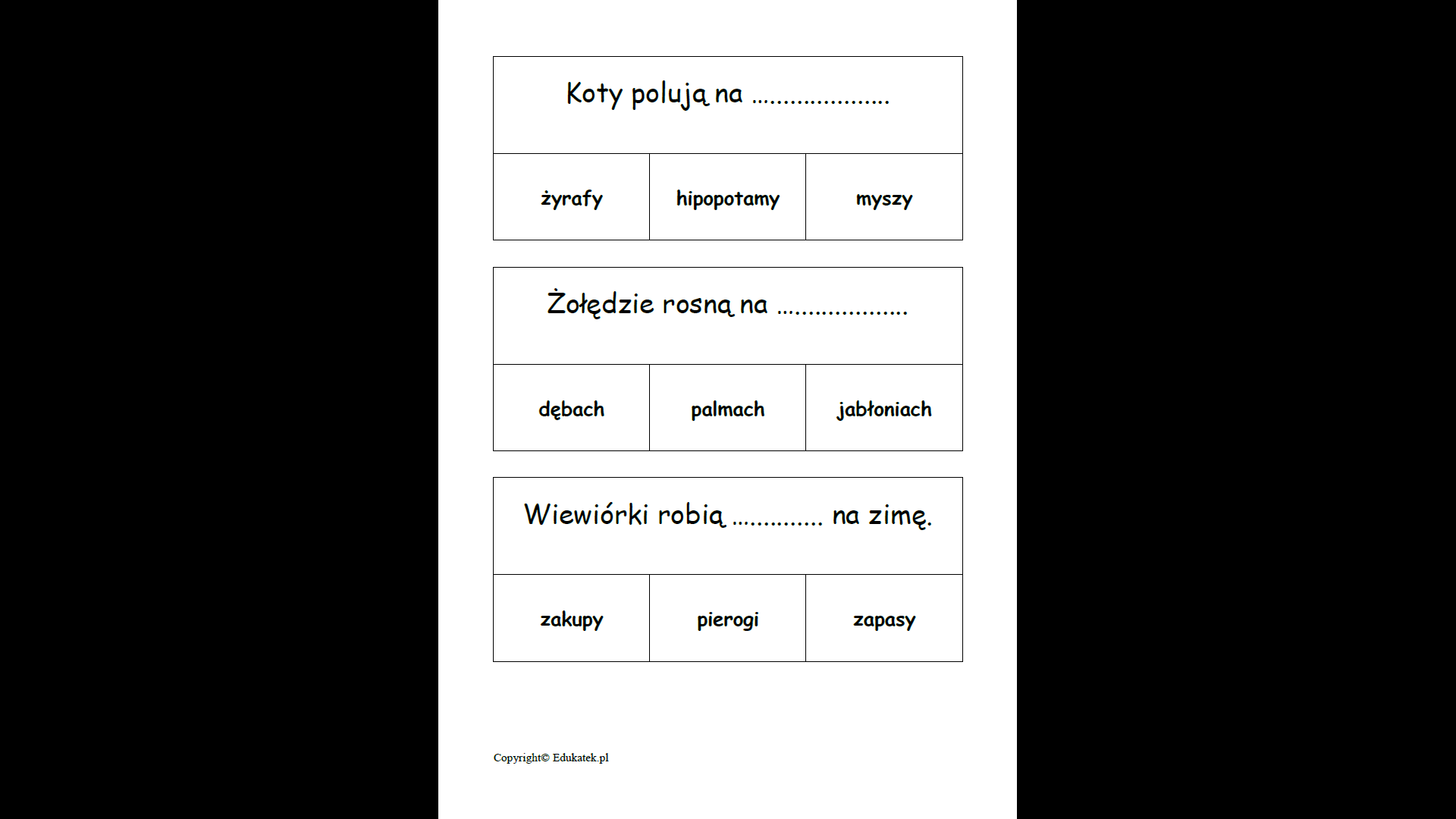 W skład zestawu wchodzi 51 kart do samodzielnego wydrukowania. Każda karta zawiera zdanie z trzema wyrazami do wyboru.