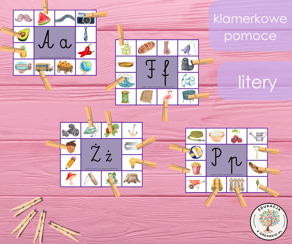 Zestaw zawiera 27 kart z literą. Zadaniem dziecka jest zaznaczenie klamerką obrazków, które odpowiadają podanej na środku literce. Pomoc ta ćwiczy motorykę małą oraz dużą, a także rozwija umiejętność spostrzegawczości, oraz umiejętność rozpoznawania cyfr oraz liczenia.