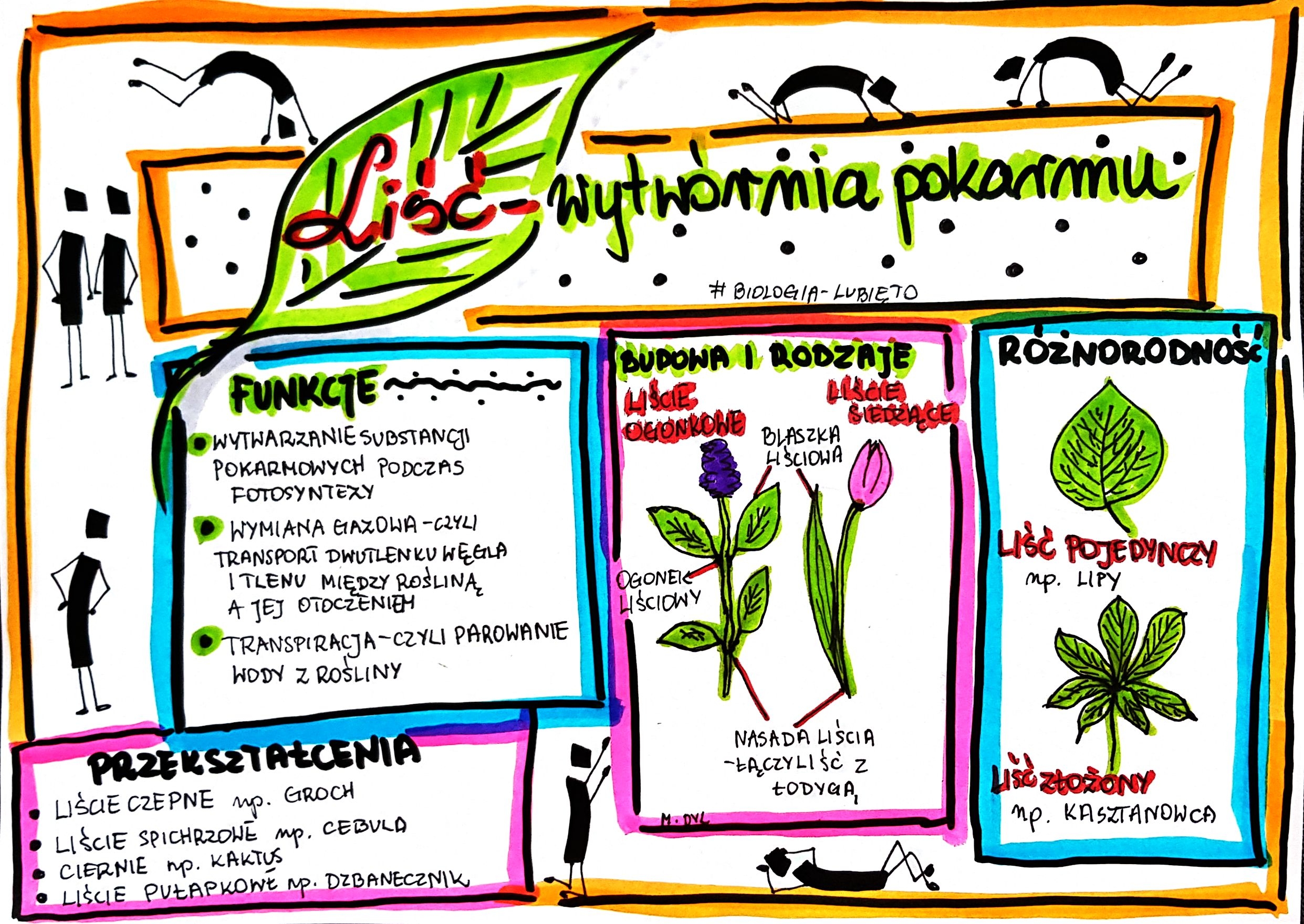 Hej, nazywam się Mariola Dyl, jestem nauczycielką biologii i przyrody w szkole podstawowej. Uwielbiam pracę z dziećmi i młodzieżą, marzę o szkole bez ocen, rywalizacji i wszechobecnej papierologii. W swojej pracy kieruję się zasadą "Bądź takim nauczycielem, jakiego chciałbyś dla swojego dziecka". Lubię angażować uczniów w myślenie, pobudzać ich kreatywność, dawać tak zwane „pole do popisu” ich wyobraźni i spontaniczności. Materiał, który przygotowuję tworzę przede wszystkim z myślą o uczniach. To dla nich przyswajanie wiedzy ma być przyjemnością. Obserwując niechęć uczniów do notowania w sposób tradycyjny, zauważyłam, że te same treści w innej formie są o wiele łatwiejsze do zapamiętania. Im więcej słów chcemy przekazać, tym nasza notatka staje się dłuższa i trudniejsza do zapamiętania. Zastąpienie ich rysunkami, symbolami, grafiką pozwala na wzmocnienie procesu myślenia u ucznia. Ułatwia notowanie, zapamiętywanie, a jednocześnie pobudza mózg do myślenia. Jeśli jeszcze uczeń – szczególnie ten młodszy, może dodatkowo „współtworzyć” notatkę – poprzez wypełnianie karty pracy, jej kolorowanie, kreowanie całości – zapomina, że właśnie się uczy. I to jest efekt, do którego dążę. Swoją pasją chcę też dzielić się z innymi wspaniałymi nauczycielami, których każdego dnia odkrywam w mediach społecznościowych. Czerpię z ich kreatywności, dają mi ogromną moc i chęć pogłębiania wiedzy i rozwoju osobistego. To także ukłon w stronę rodziców, którzy w natłoku codzienności pragną wspierać swoje dzieci w ich codziennych zmaganiach szkolnych. Prowadzę swój Fanpage na Facebooku i Instagramie "Biologia -Lubię to". Oprócz rysowania mam wiele innych pasji takich jak: pisanie, szkicowanie, malowanie, ogród, bieganie, joga i podróże. Zaglądajcie też na moja stronę https://biologia-lubieto.pl/ Zapraszam Mariola