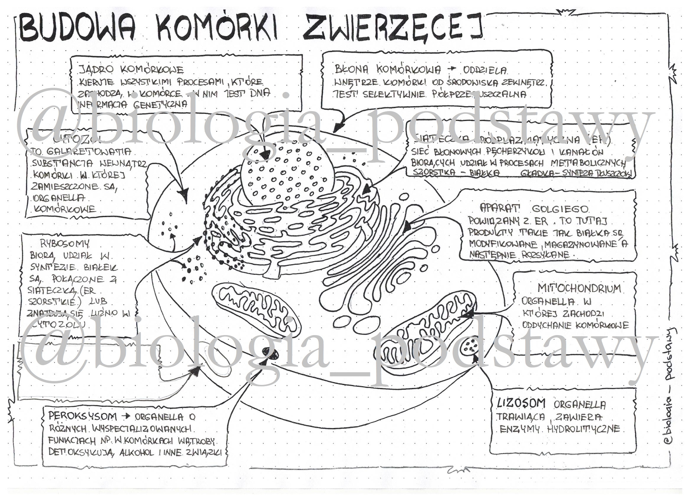 Budowa komórki zwierzecej - sketchnotka jako gotowa notatka z lekcji.
