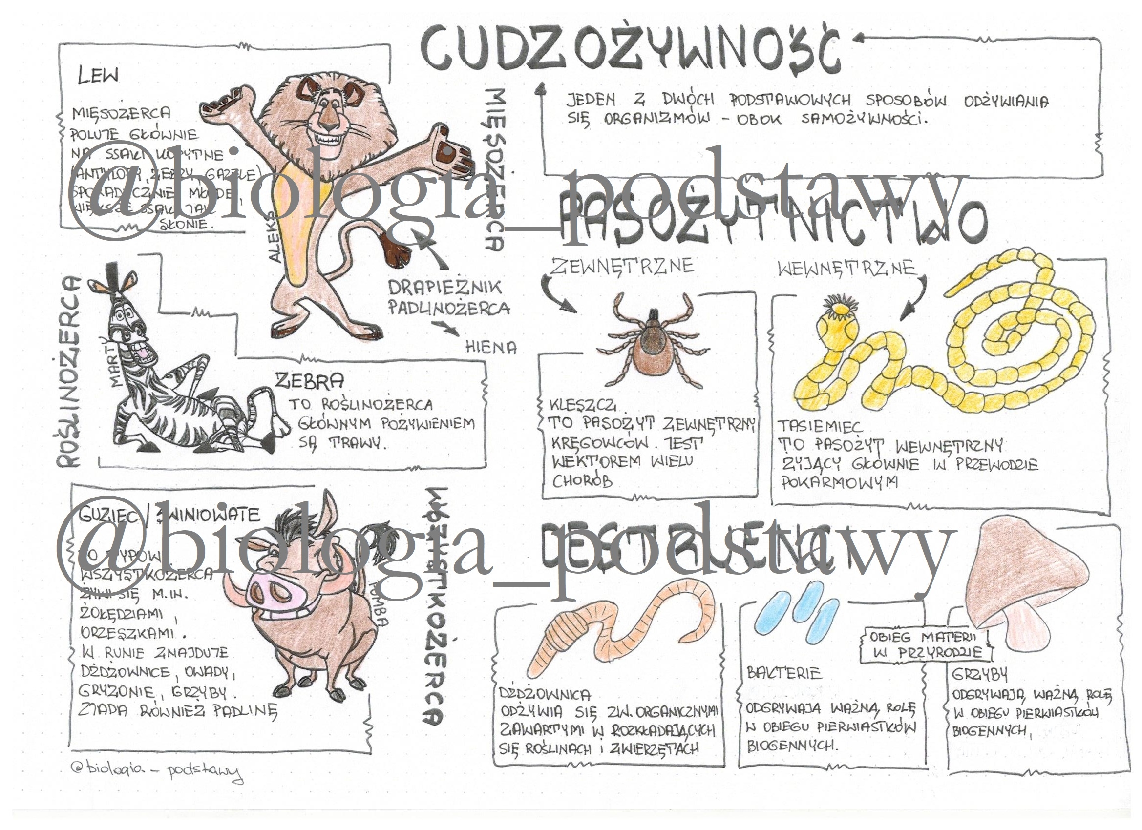 Cudzożywność - sketchnotka jako gotowa notatka z lekcji w wersji kolorowej.