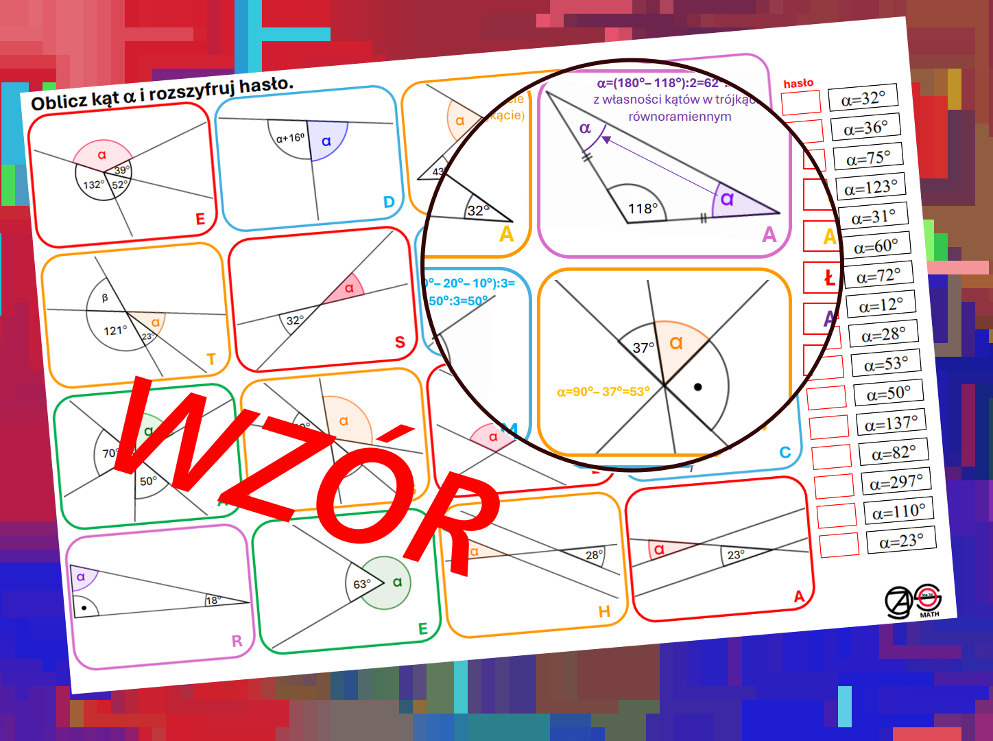 Karta pracy utrwalająca pojęcia kątów przyległych, wierzchołkowych, odpowiadających, naprzemianległych oraz kątów w trójkątach. Po obliczeniu miar kątów należy uzupełnić hasło.
