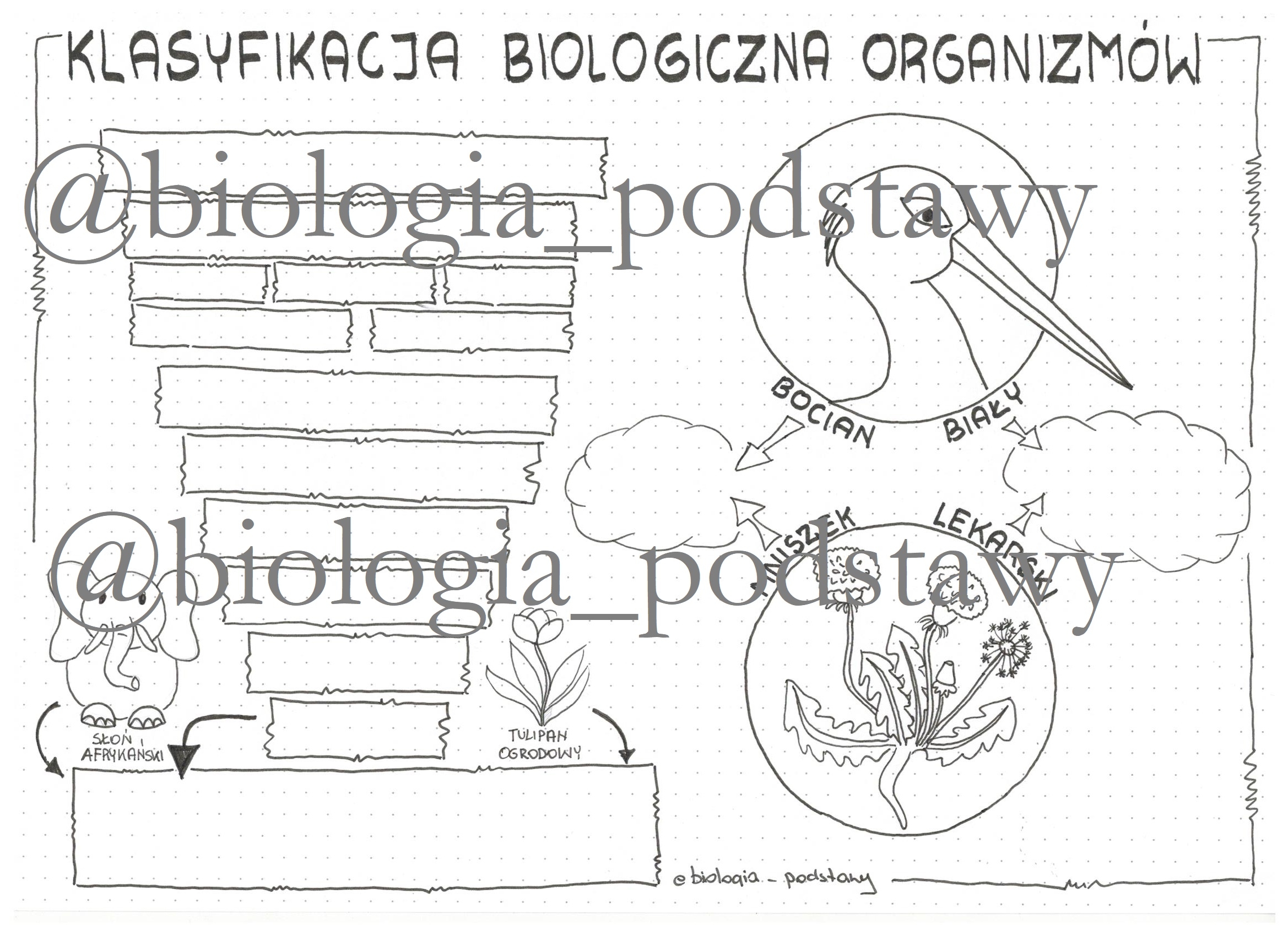 Klasyfikacja organizmów - klasa 5 - sketchnotka jako gotowa notatka z lekcji w formie KP do uzupełnienia.