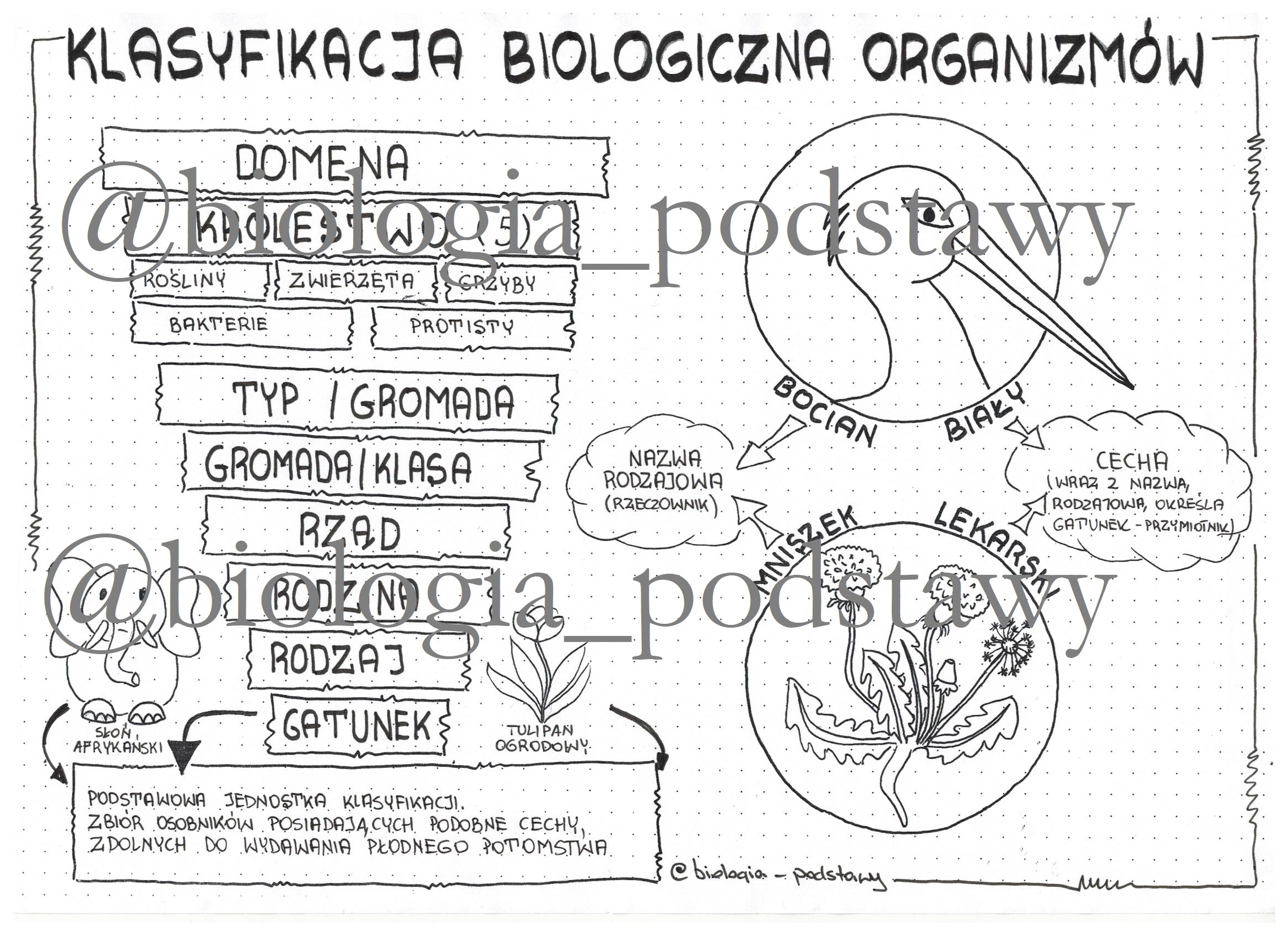 Klasyfikacja organizmów - klasa 5 - sketchnotka jako gotowa notatka z lekcji do pokolorowania.