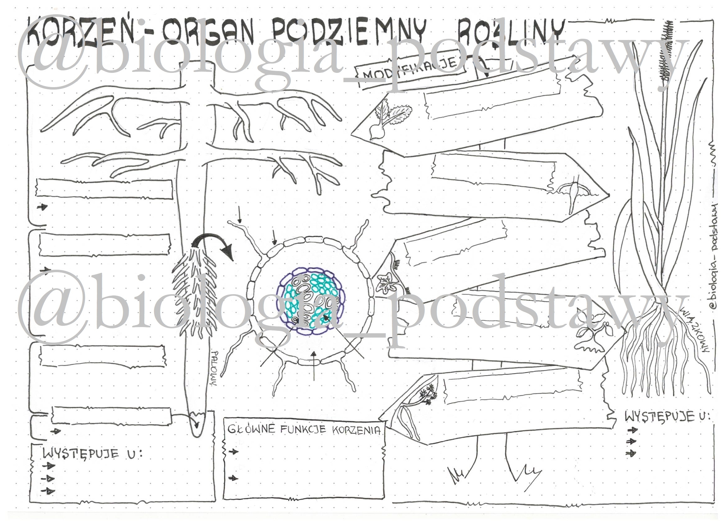 Korzeń - organ podziemny rośliny - sketchnotka jako gotowa notatka z lekcji w formie KP do uzupełnienia.