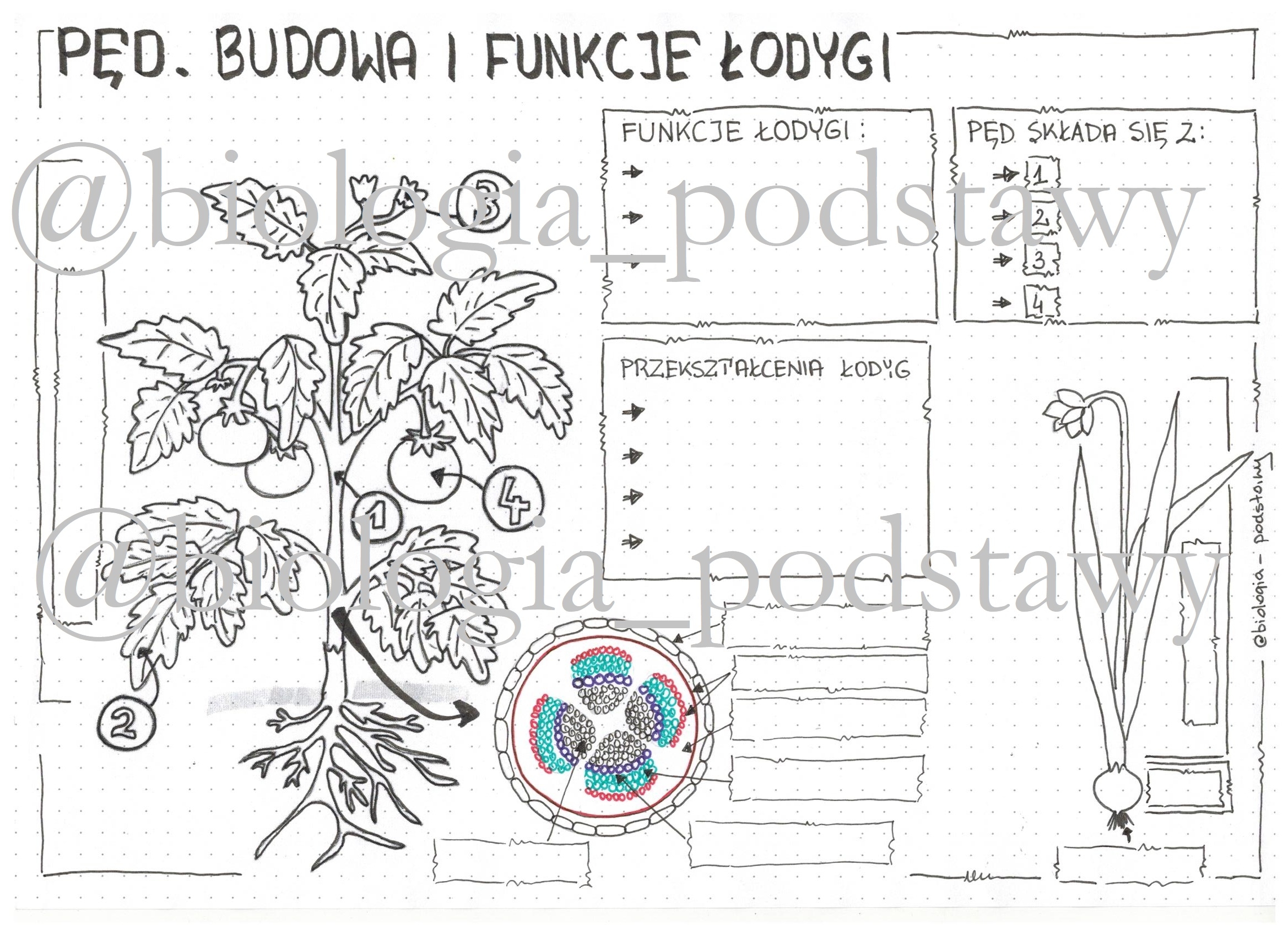 Pęd. Budowa i funkcje łodygi - sketchnotka jako gotowa notatka z lekcji w formie KP do uzupełnienia i pokolorowania.