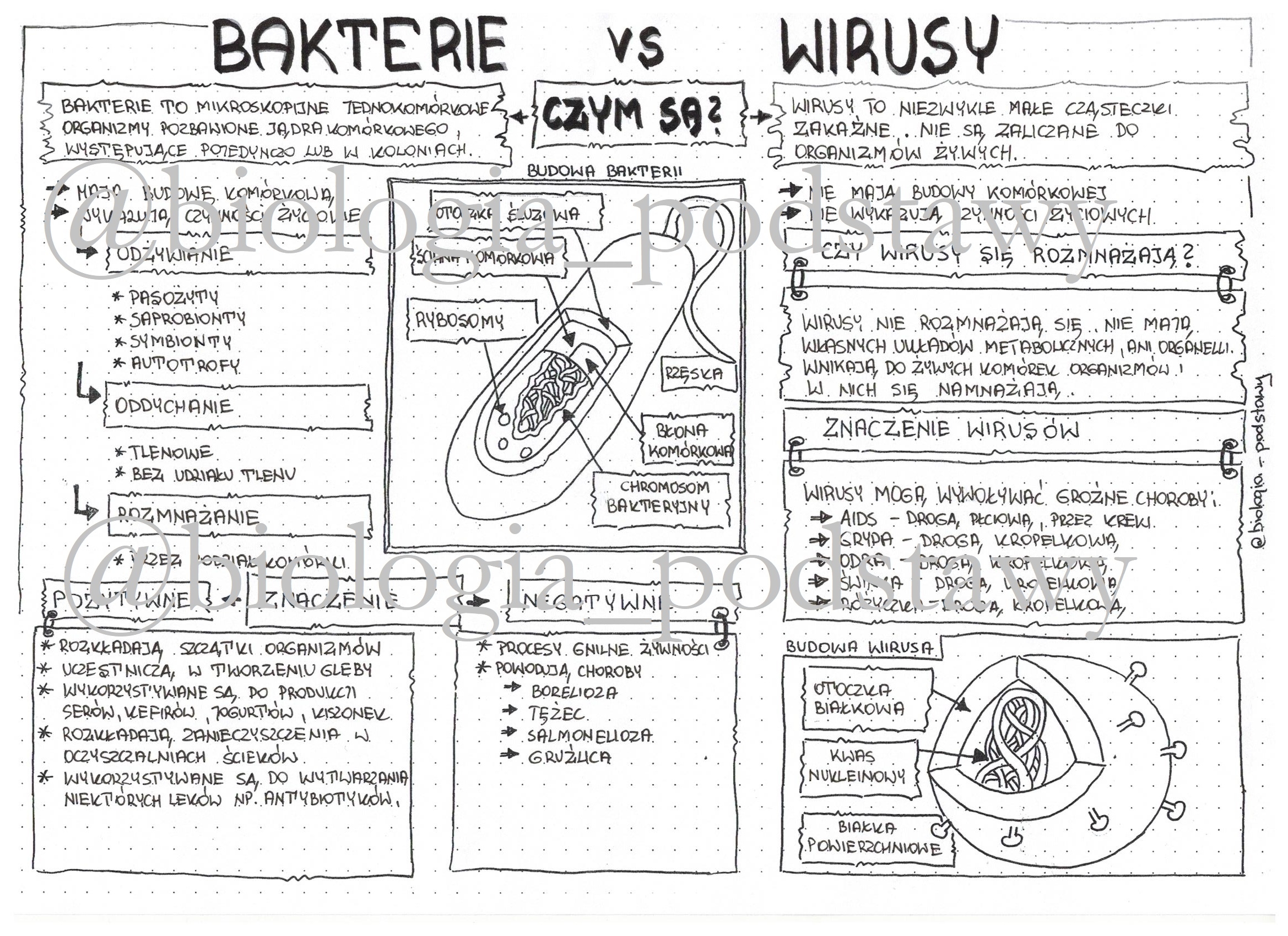 Wirusy i bakterie - sketchnotka jako gotowa notatka z lekcji do pokolorowania.