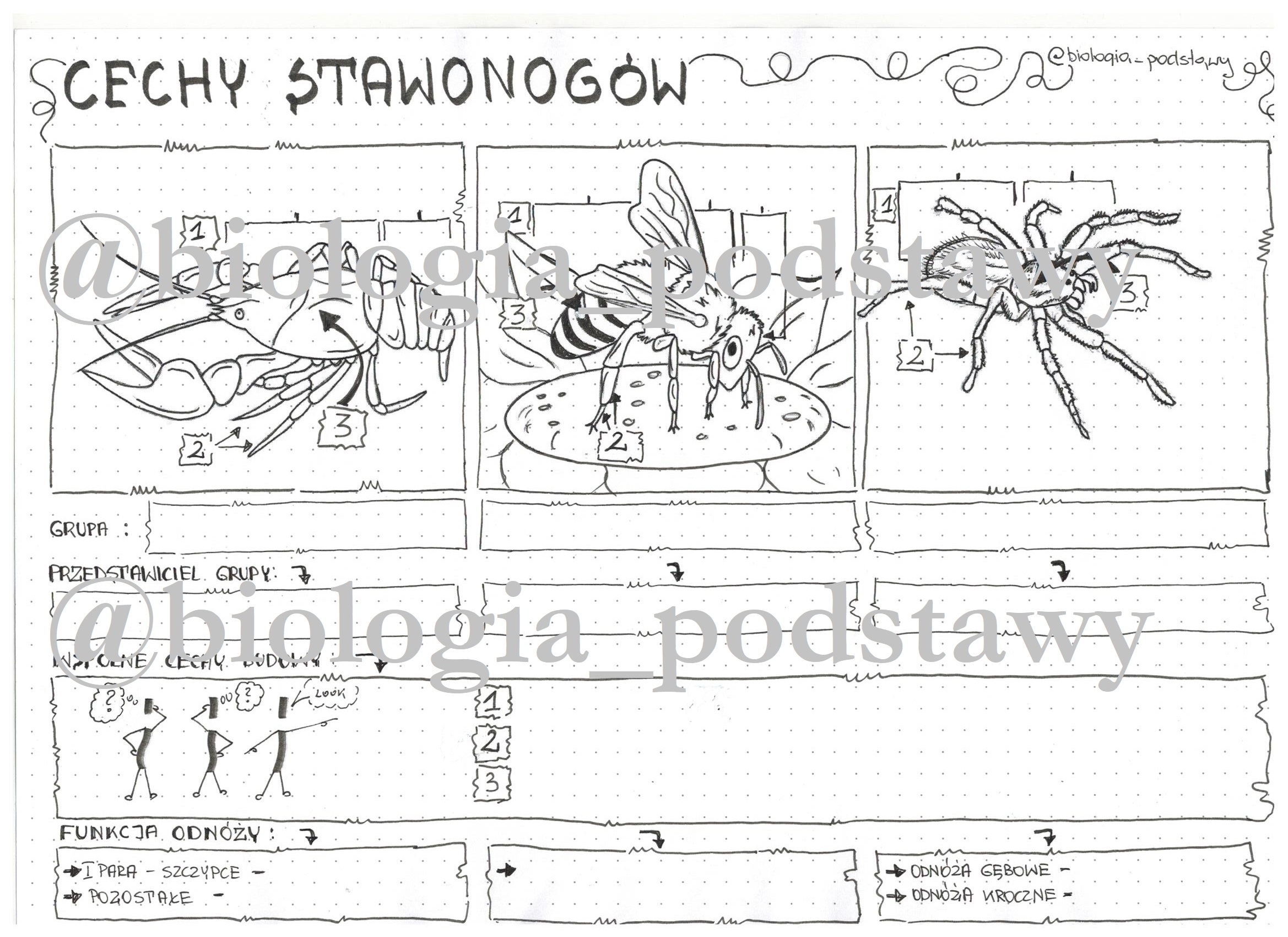 Sketchnotka "Cechy stawonogów" jako gotowa notatka z lekcji w formie KP do uzupełnienia i pokolorowania.