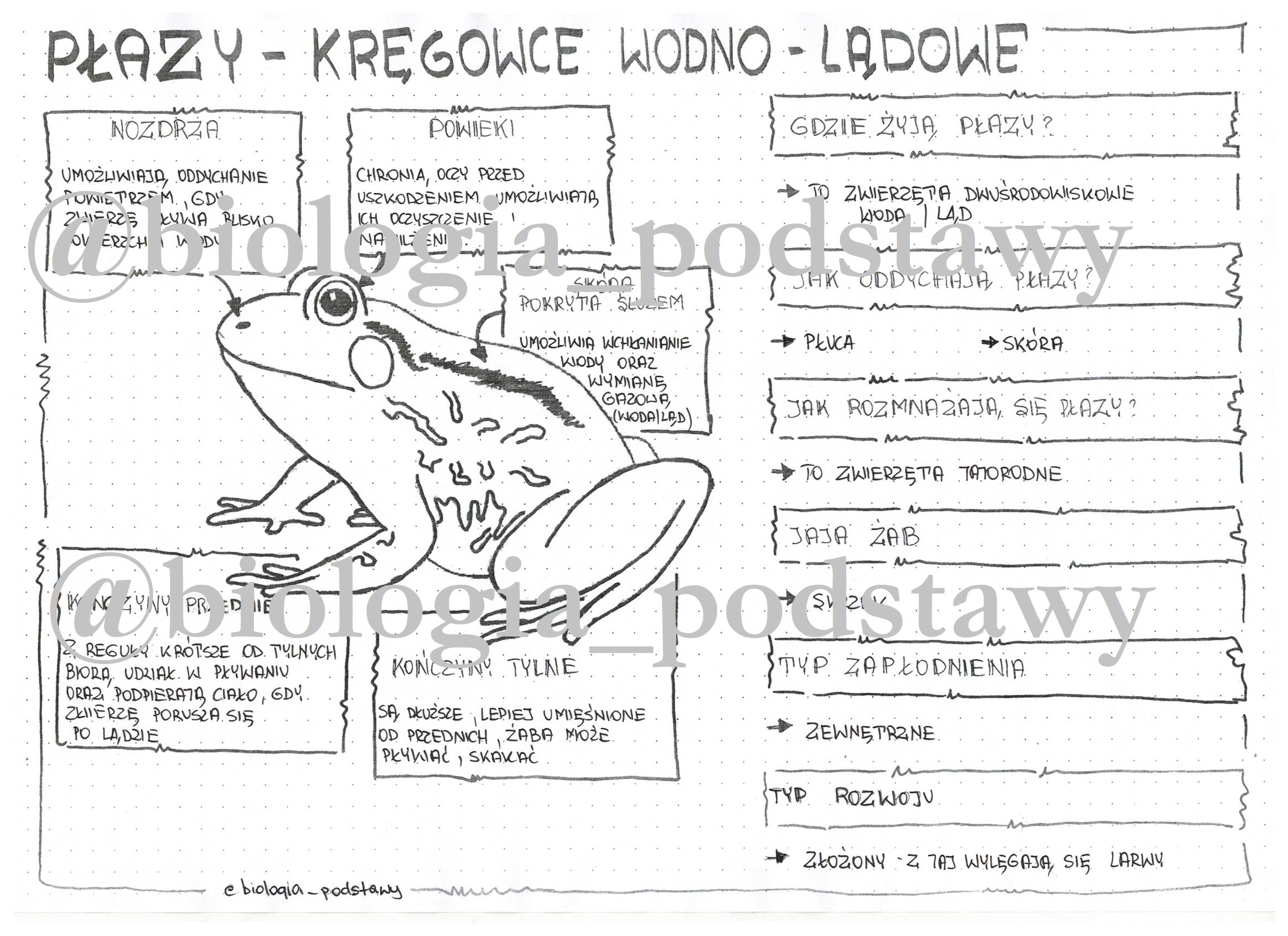 Płazy - sketchnotka jako gotowa notatka z lekcji do pokolorowania.