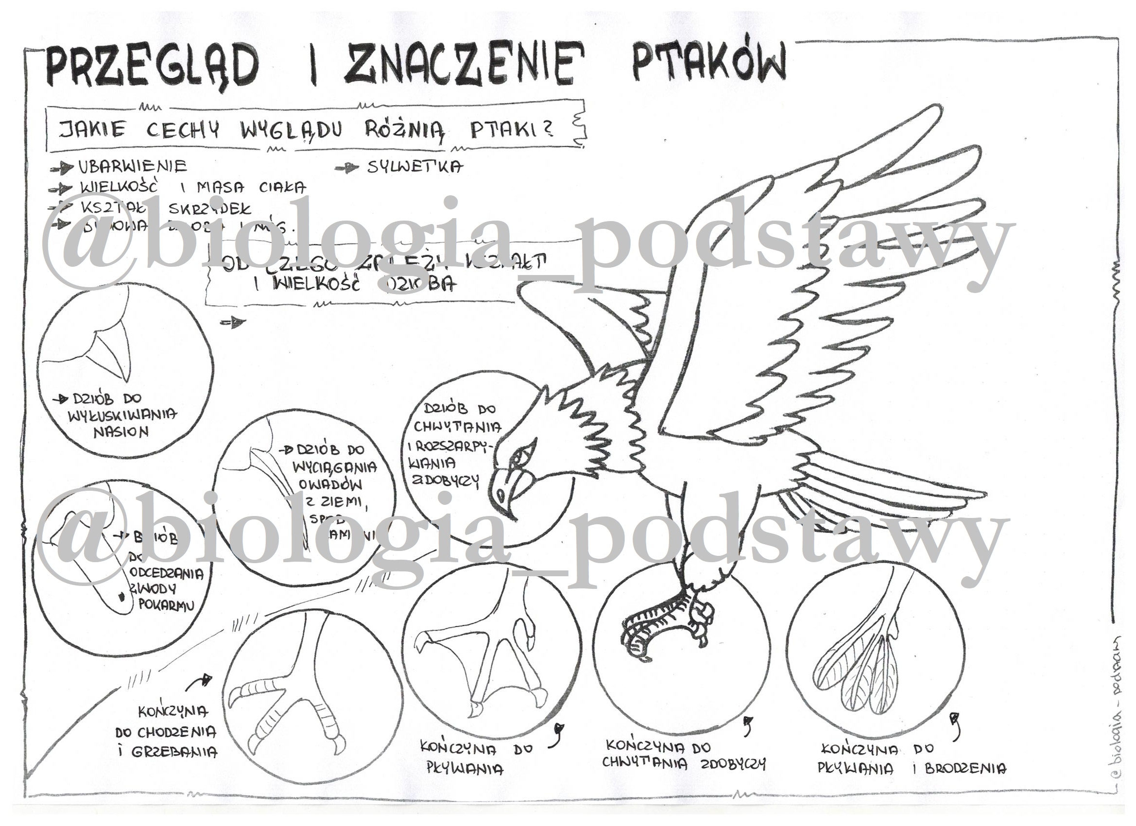 Ptaki - sketchnotka jako gotowa notatka z lekcji do uzupełnienia.