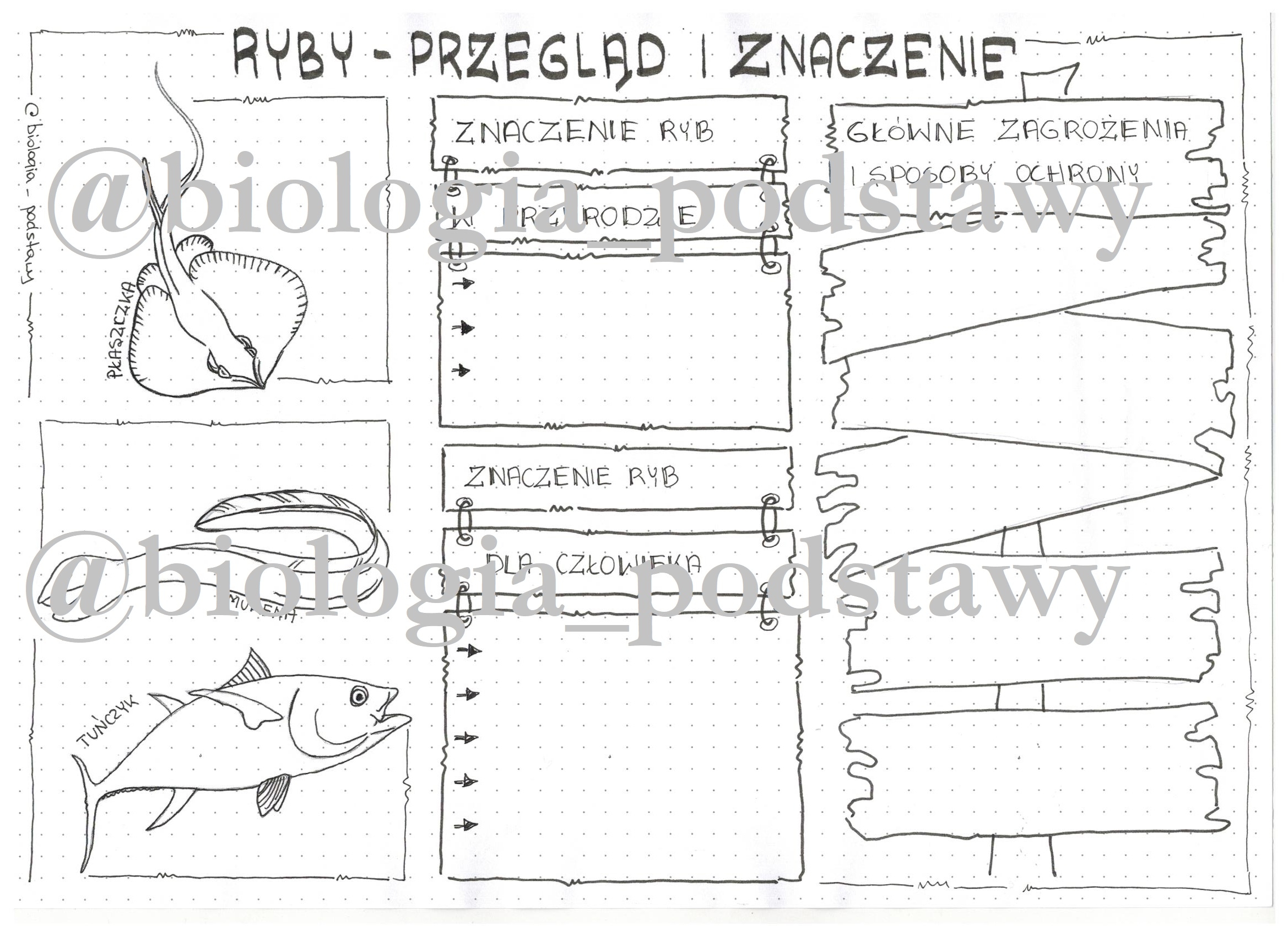 Ryby - przegląd i znaczenie - klasa 6 - sketchnotka jako karta pracy do uzupełnienia i pokolorowania.