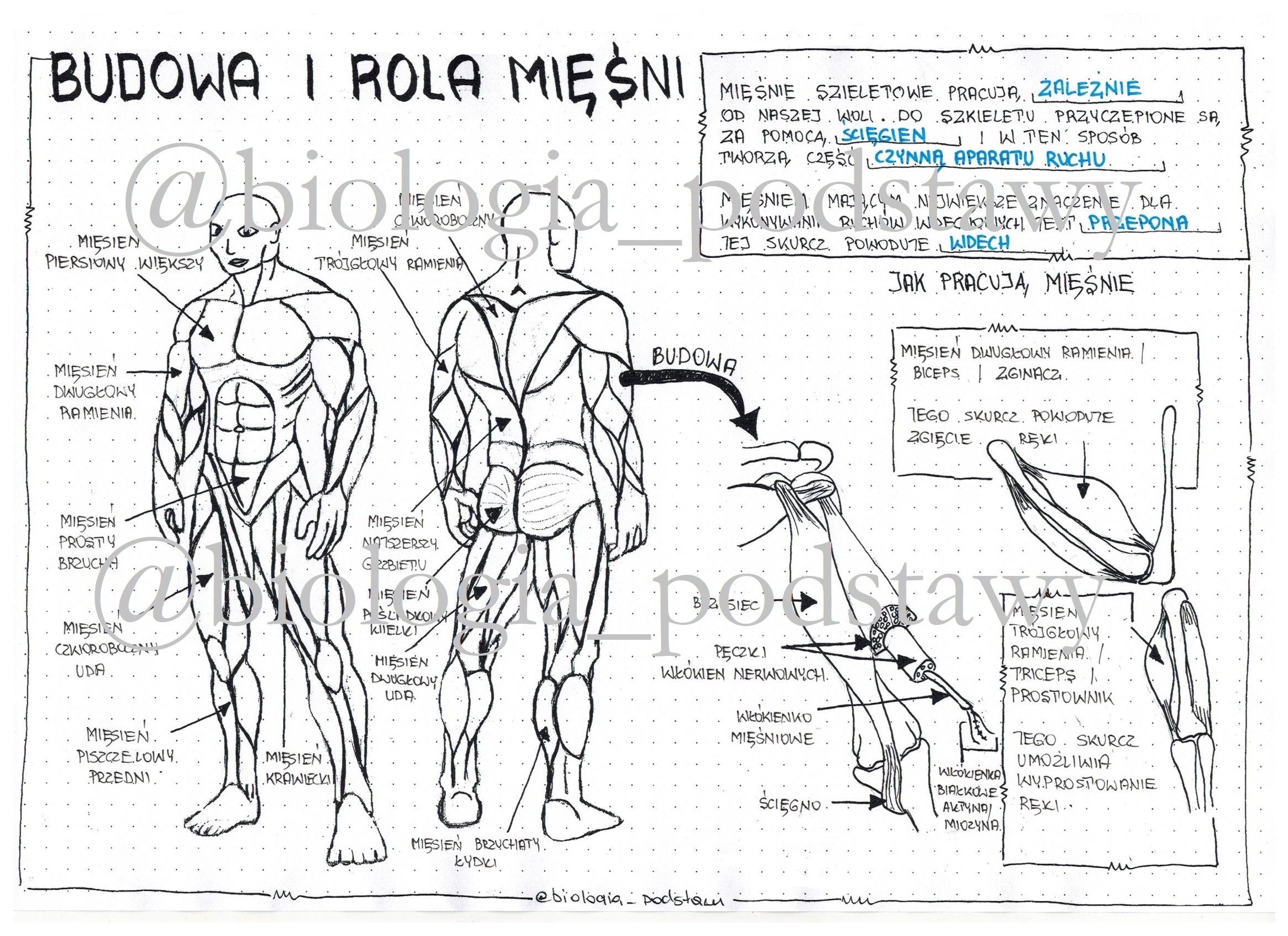 Sketchnotka "Budowa i rola mięśni" jako gotowa notatka z lekcji.